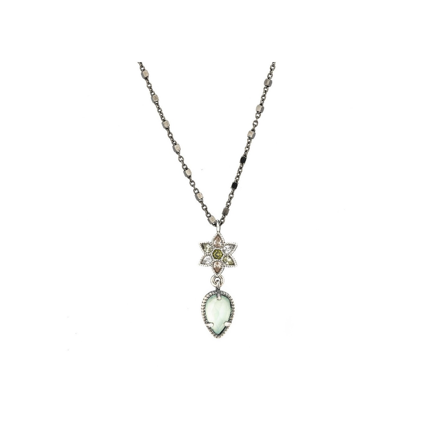 Anillo Raive C976, una joya que destaca por su elegancia y originalidad. Este colgante de plata está engastado con piedras semipreciosas y luce una piedra central de calcedonia facetada en forma de lágrima de 9x12mm. La flor decorativa combina circonitas en tonos cava, verde y blanco, aportando un toque de color y sofisticación. El colgante mide 28mm de largo y cuelga de una cadena de plata con baño de rutenio de 45cm. Un diseño elaborado en España de manera 100% artesanal, ideal para quienes buscan piezas únicas y con personalidad.