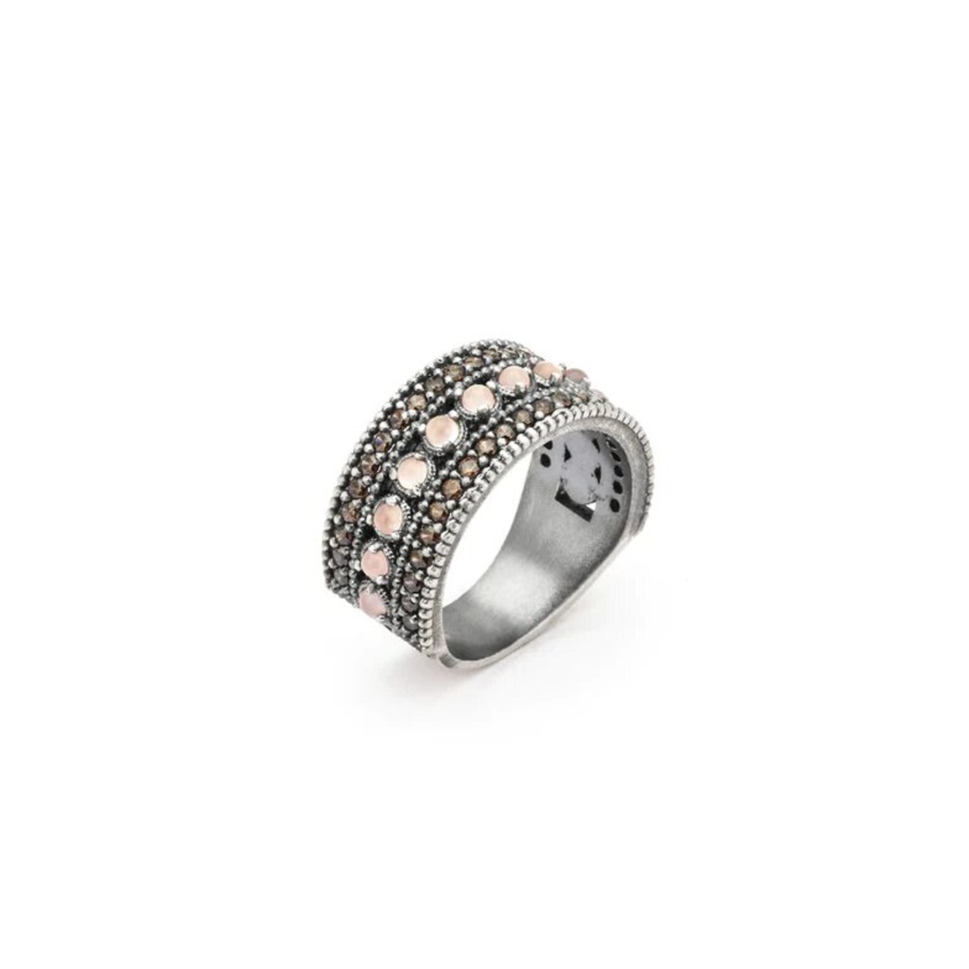 Anillos Raive Ojo Gato Rosa y Circonitas Marrón 15352: un diseño artesanal en plata que destaca por su piedra central ojo de gato rosa y circonitas marrón. El ancho del brazo es de 10 mm y está disponible en varias tallas. Hecho en España con un estilo único y elegante, es perfecto para quienes buscan un toque especial y diferente en sus accesorios diarios.