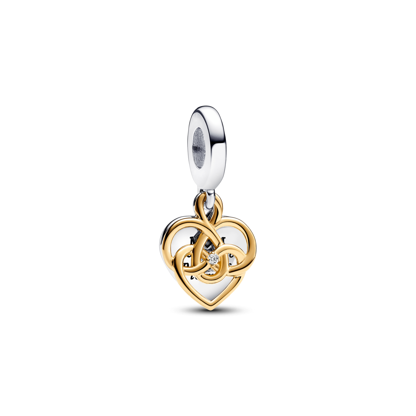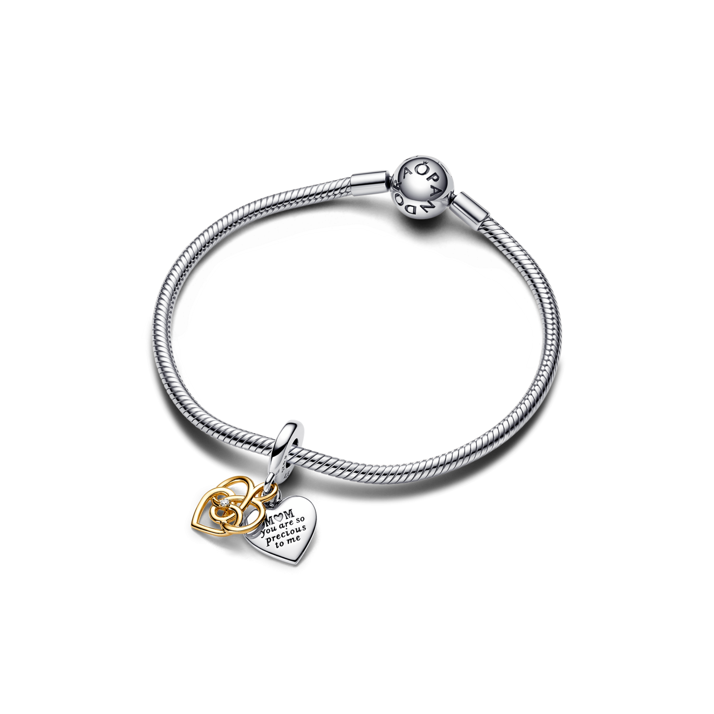 Charm Pandora Colgante Doble, Dorado y con Diamante Sintético, Grabable Mamá 763237C01 es el abalorio pandora perfecto para expresar cuánto significa tu mamá para ti. Este charm combina la elegancia del recubrimiento en oro de 14k con la belleza de un diamante sintético creado en laboratorio. En el corazón de plata lleva grabado "Mamá eres tan preciosa para mí" y, además, puedes personalizar la parte trasera con el mensaje que elijas. Es el regalo ideal para sorprender a tu madre y recordarle lo especial que es cada día.