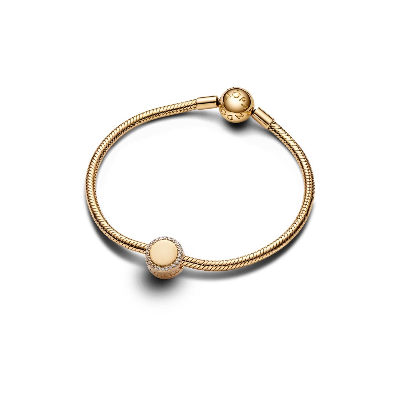 Charm Pandora Grabable Boton Brillante 768747CO1: un abalorio pandora único, hecho a mano en plata con baño dorado y circonitas, perfecto para llevar tus palabras más especiales siempre contigo. Personalízalo con el mensaje que elijas, grabado por uno o ambos lados.