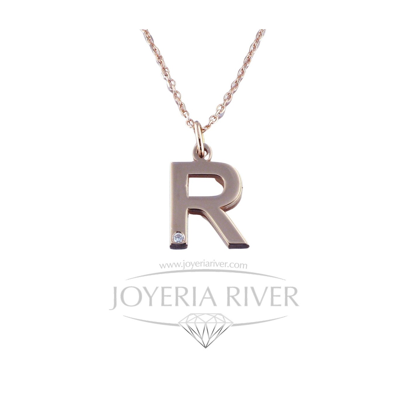 Colgante Oro Rosa y Diamantes Letra ""R"" R398I734: una joya elegante y personal para llevar siempre contigo. Fabricado en oro rosa, este colgante destaca por su delicadeza y el brillo sutil de un diamante talla brillante calidad HVS de 0.008 kt. Su peso aproximado es de 1.7 gramos, y la cadena de oro rosa mide 42 cm, con opción de ajustarla a 40 cm para mayor comodidad.