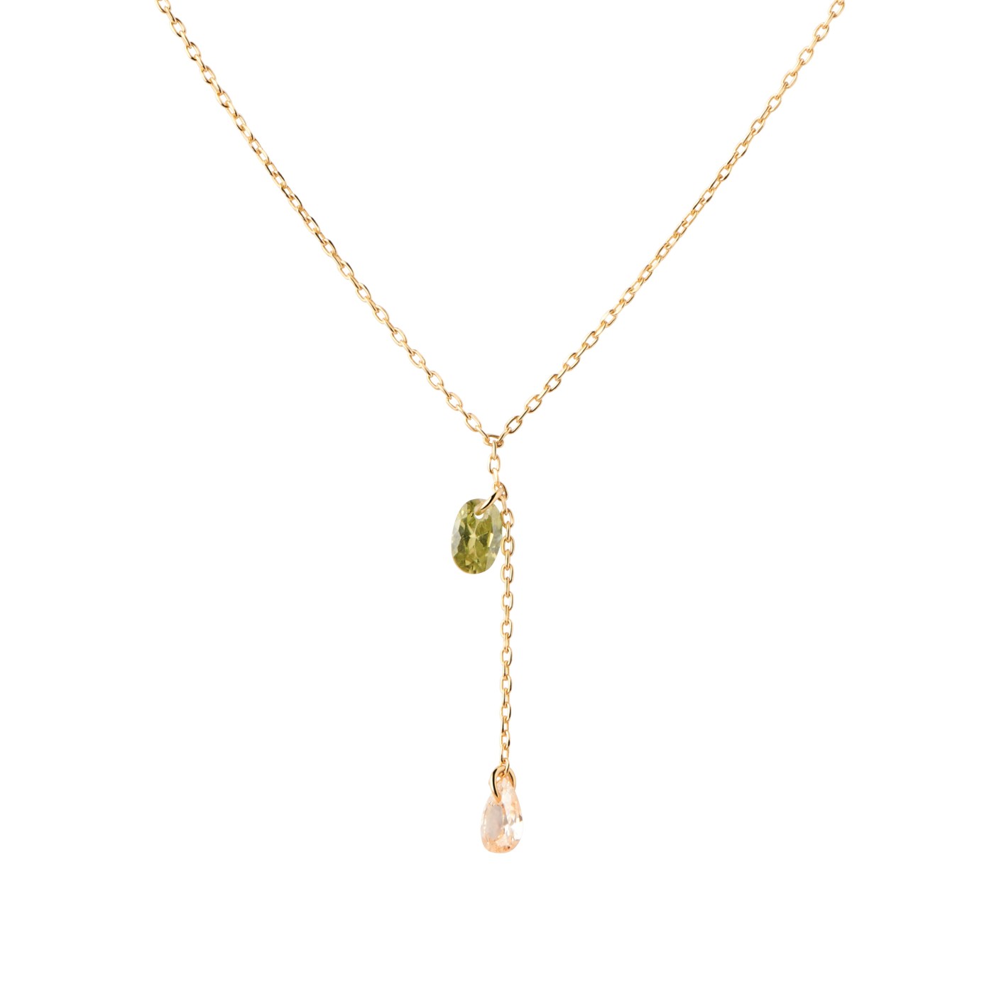 Colgante Pdpaola Linda CO01-863-U, una joya de plata de ley con baño IP dorado que destaca por su diseño elegante y actual. Sus dos piedras colgantes, una en tono champán y otra en verde, aportan un toque de color y sofisticación a cualquier look. Perfecto para llevar a diario o para ocasiones especiales, este colgante es el detalle ideal para realzar tu estilo con un toque único y personal.