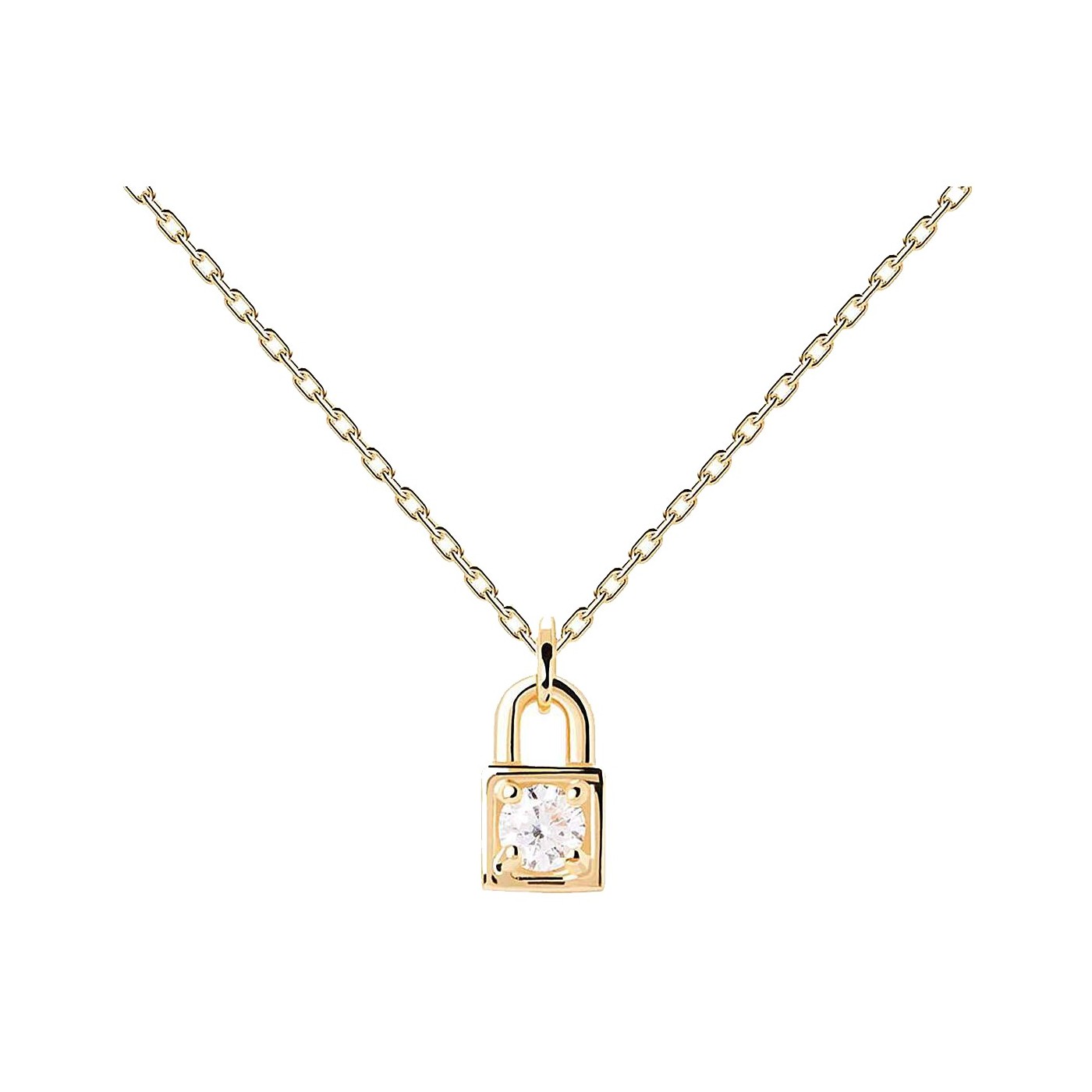 Colgante Pdpaola Padlock CO01-487-U: un diseño en plata con baño de oro, en forma de candado y con una circonita blanca que aporta un toque elegante y moderno. Perfecto para llevar a diario o para regalar a alguien especial que valore los detalles únicos y el significado de protección y seguridad que representa el candado.