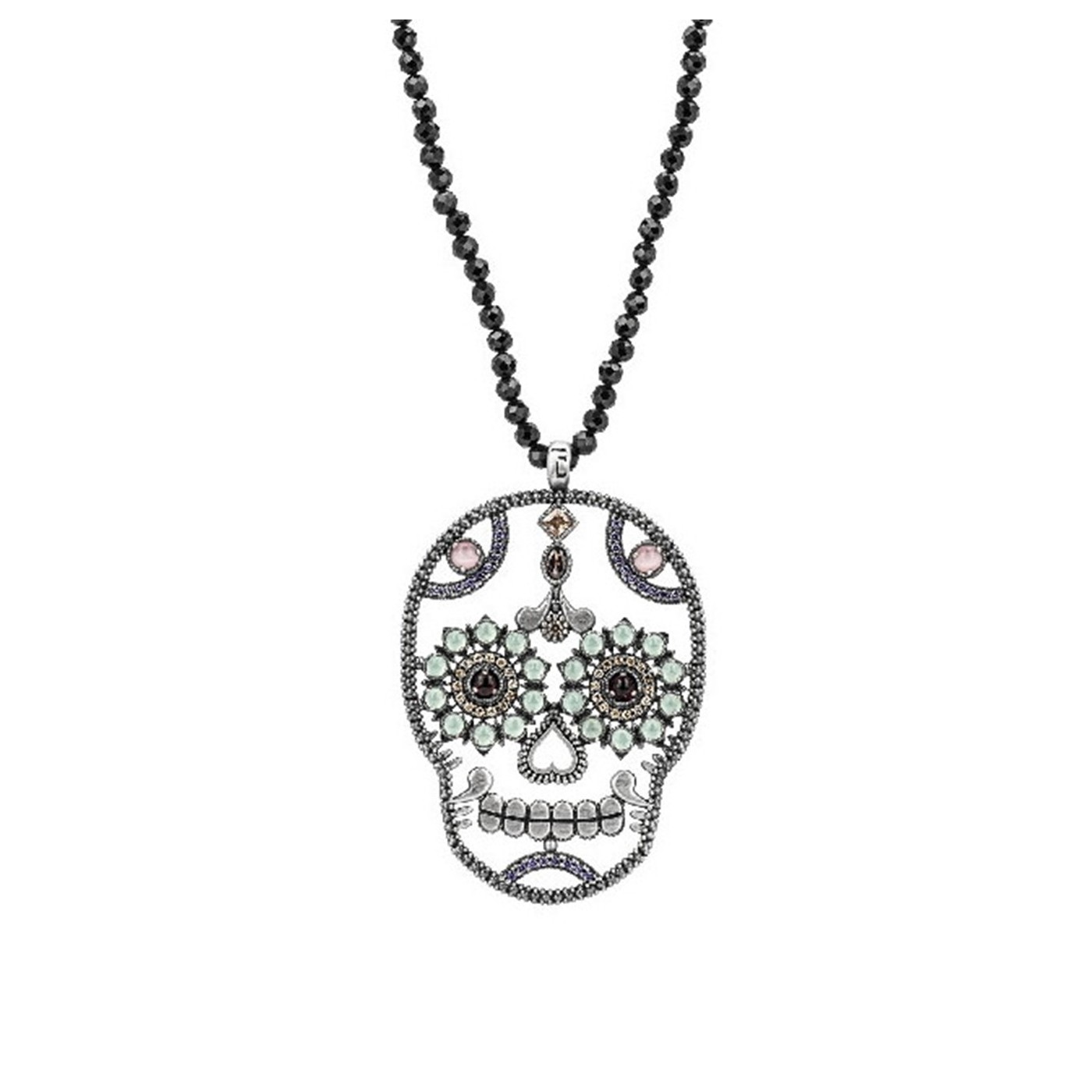 Colgante Raive Calavera SKS131: una pieza única de plata con diseño de calavera mexicana, engastada con piedras semipreciosas como calcedonia, ojo de gato, granate y circonitas. Sus medidas son 65x48mm e incluye una cadena de ónix de 70cm. Elaborado artesanalmente en España, este colgante es perfecto para quienes buscan un accesorio original y lleno de personalidad.