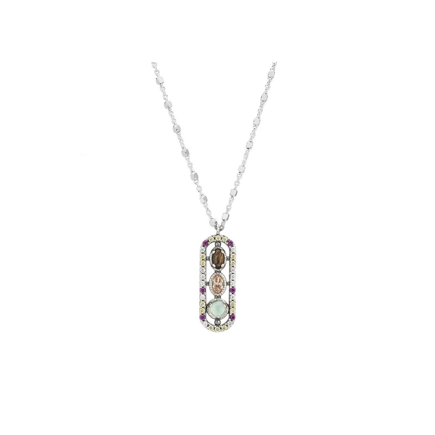 Colgante Raive FAT-25, una joya de plata con un diseño artesanal único, elaborado en España. Este colgante de Fátima está engastado con piedras semipreciosas: calcedonia en el centro, ojo de tigre y circonitas en blanco, fucsia y verde claro. Mide 10x27 mm y viene acompañado de una cadena de plata de 42 cm. Perfecto para quienes buscan un toque especial y protector en su día a día.