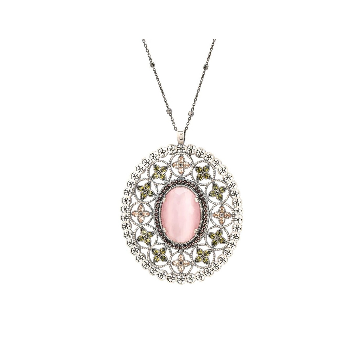 El Colgante Raive Oval Ojo Gato Rosa y Circonitas C811 es una joya en plata de ley con un diseño elegante y femenino. Su piedra central, un Ojo de Gato Rosa, destaca en el centro del colgante ovalado de 55x64 mm, mientras que las circonitas en tonos marrón, verde y champagne forman delicadas florecitas a su alrededor. Añade un toque de color y sofisticación a tu look diario con este colgante único y especial.