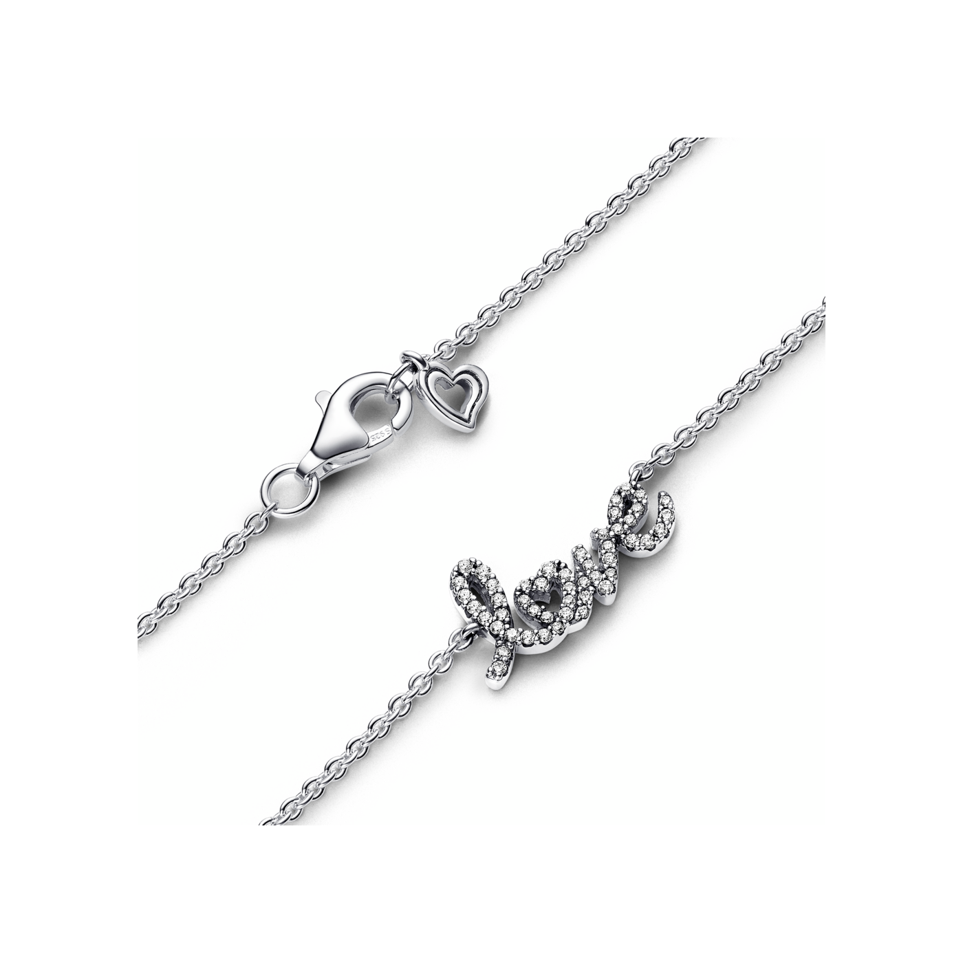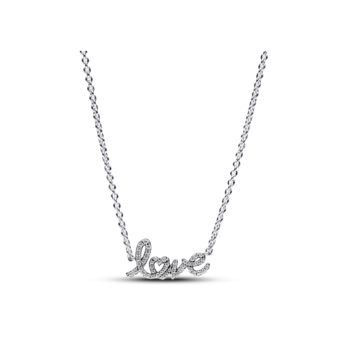Collar Pandora plata Love Escrito a Mano Brillante 393076C01: una joya en plata de ley con la palabra "Love" escrita a mano y decorada con circonitas blancas que aportan un toque de luz y elegancia. Su longitud de 45 cm lo hace perfecto para lucirlo a diario o en ocasiones especiales. Este collar es el detalle ideal para regalar a esa persona especial a la que quieres recordarle lo importante que es el amor en su vida, ya sea tu pareja, una amiga o un familiar cercano.