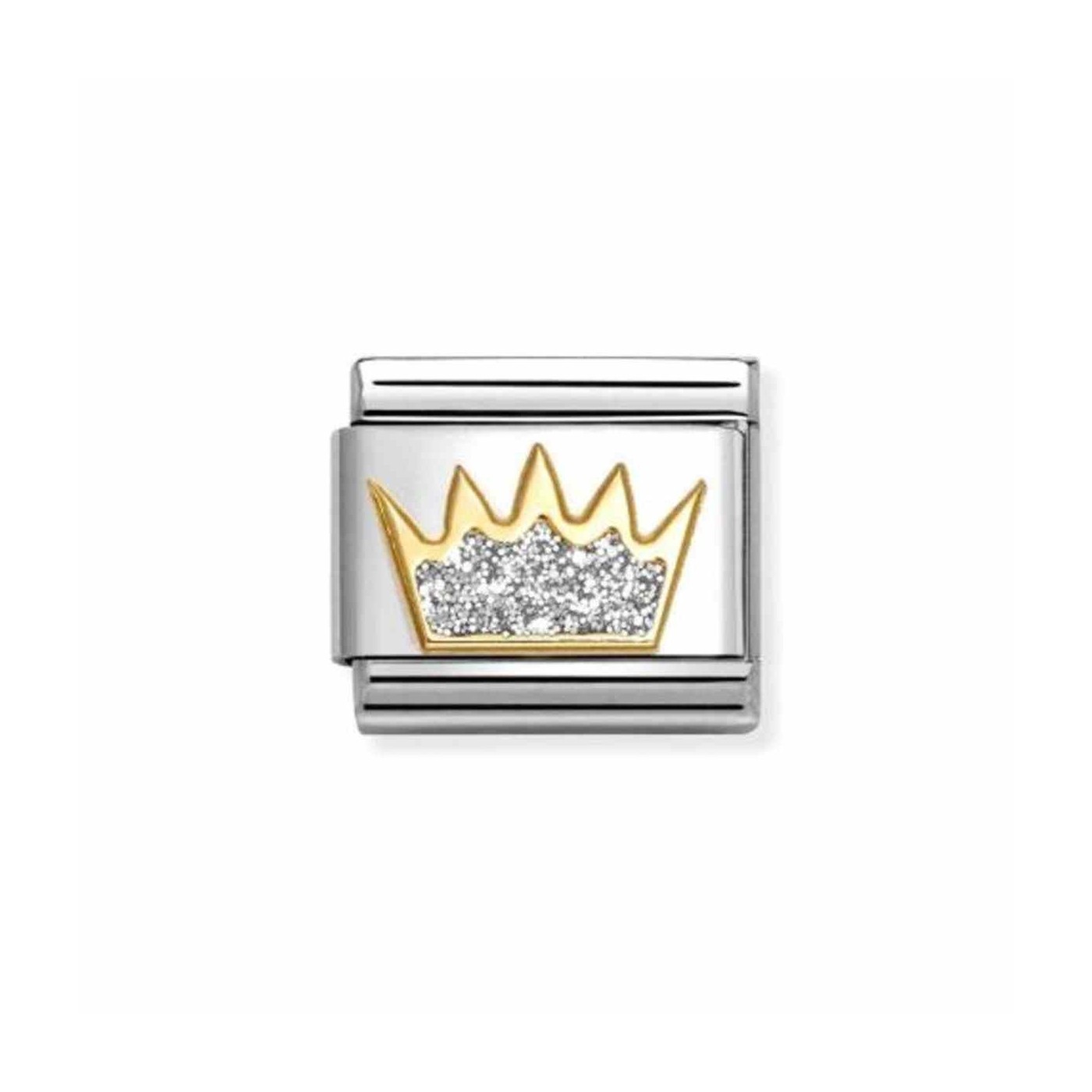 Link Nomination Acero y Oro Corona Glitter 030220 21 es el abalorio pandora perfecto para quienes buscan destacar con un toque elegante y moderno. Su diseño de corona en acabado glitter simboliza poder y confianza, ideal para regalar a esa persona especial que siempre brilla con luz propia y merece sentirse como una reina.