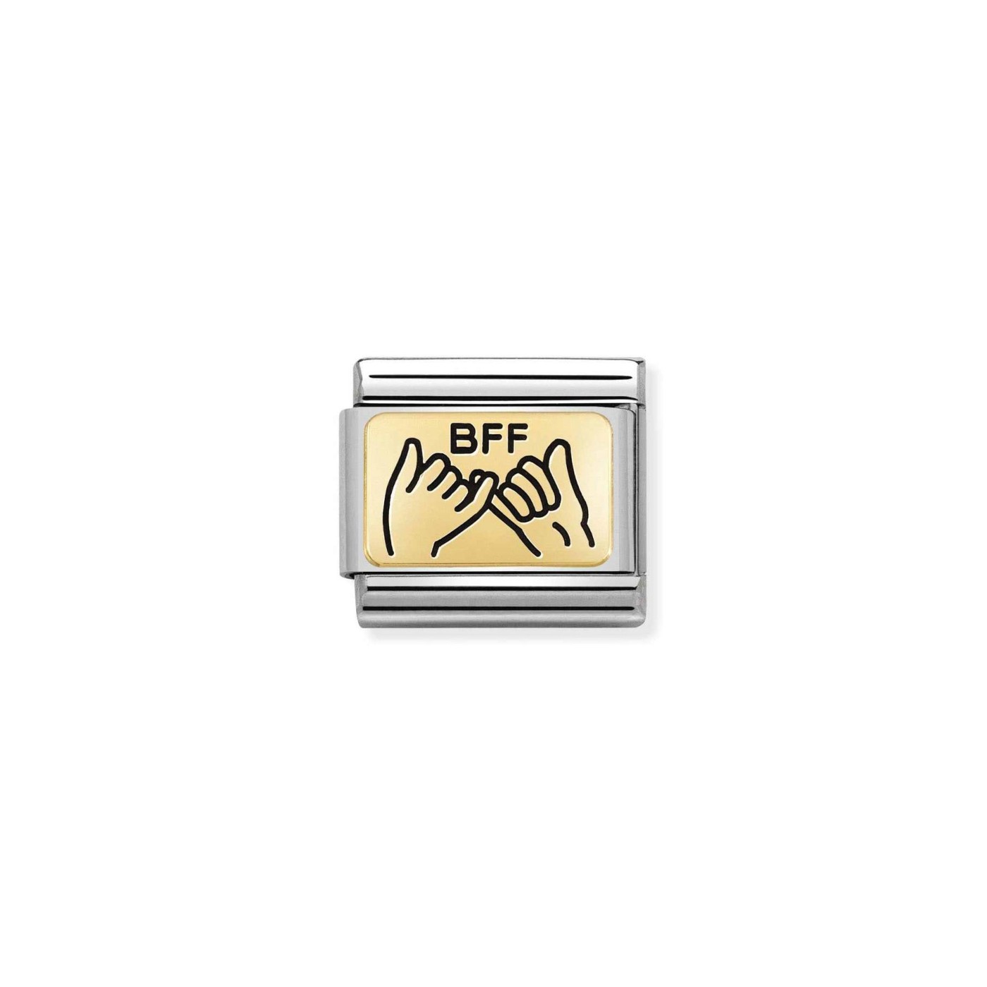 Link Nomination Acero y Oro "Mejores Amigos Promesa" 030166 04 es el detalle perfecto para celebrar esa amistad incondicional. Este link para pulsera Composable Classic está elaborado en acero, oro 750 y esmalte negro, con el texto BFF y el símbolo de promesa, recordando que los mejores amigos están para siempre. Es un regalo ideal para esa persona que ha estado a tu lado en cada momento importante, demostrando que la verdadera amistad nunca se rompe.