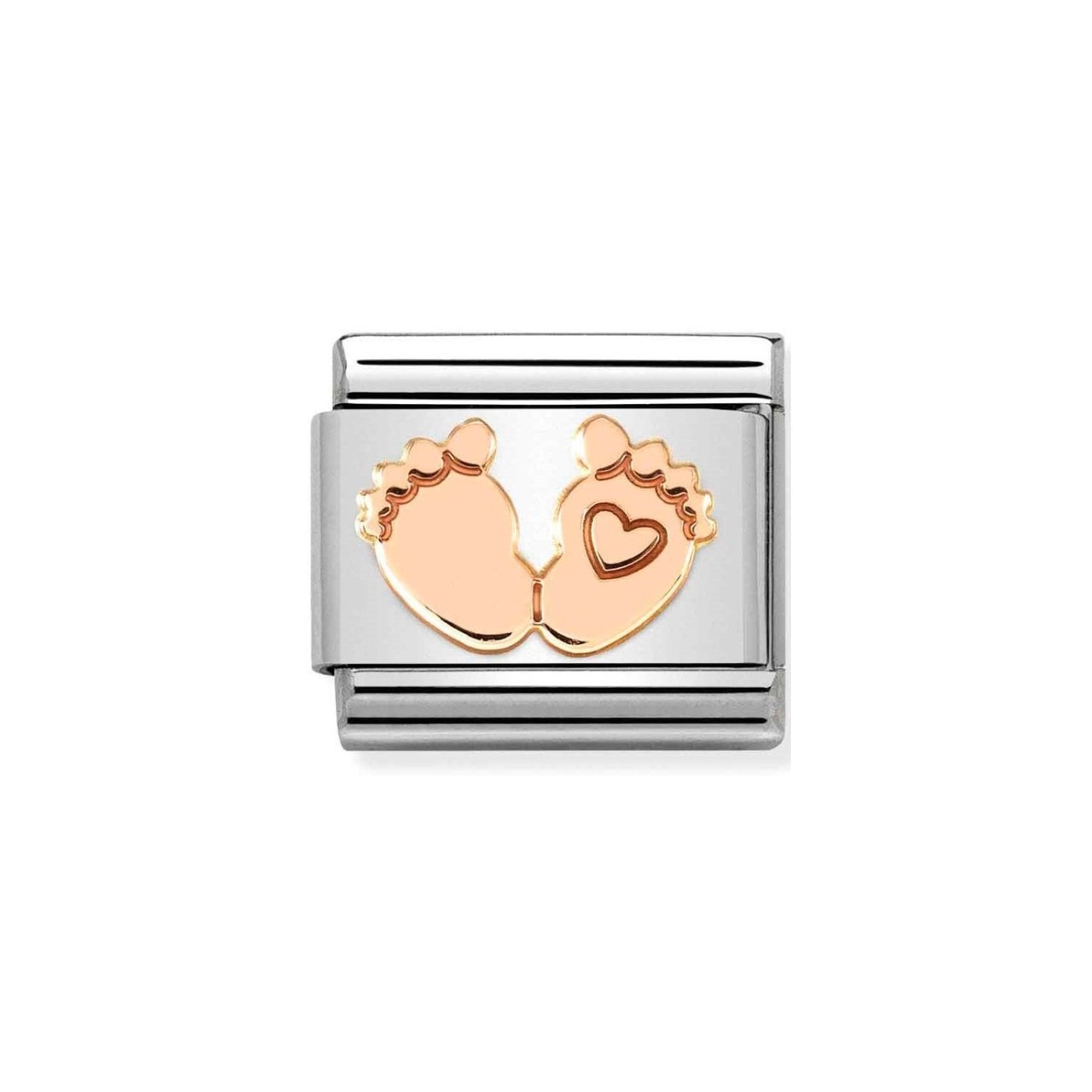 Link Nomination Acero y Oro Rosa Pies con Corazón 430104 32 es el detalle ideal para celebrar la llegada de un bebé. Este abalorio pandora, hecho en acero y oro rosa 375, muestra unos tiernos pies de bebé con un corazón, perfecto para añadir un toque especial a tu pulsera Composable Classic. Es un regalo significativo para una nueva mamá, simbolizando amor y nuevos comienzos en la familia.