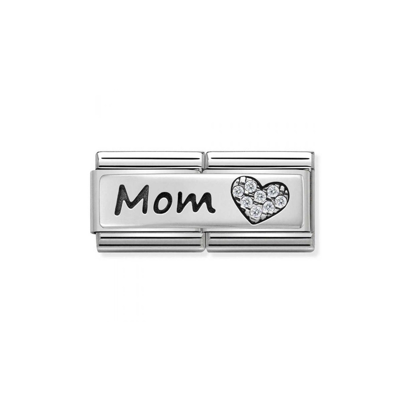 Link Nomination Doble "Mamá con amor" 330731 06 es el abalorio pandora perfecto para expresar todo tu cariño y gratitud. Este charm doble, diseñado para la pulsera Classic Composable, combina acero, plata de ley y circonita cúbica, con la inscripción "Mamá" y un delicado corazón. Hecho en Italia, es un detalle especial para recordarle a tu madre cuánto la quieres. Regálaselo a esa mamá que significa todo para ti y haz que lleve siempre un mensaje de amor en su muñeca.