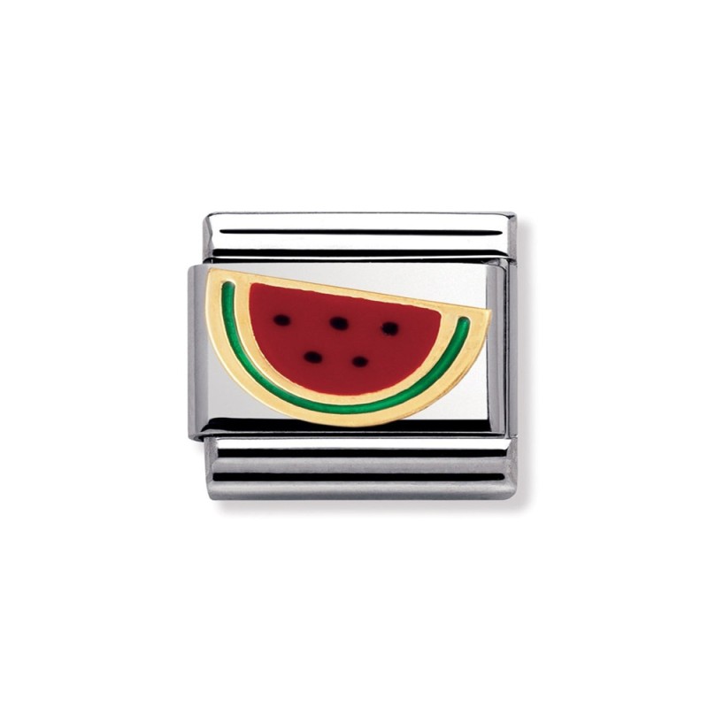 Link Nomination Oro Sandia 030215 14 es el toque divertido y colorido que tu pulsera necesita. Este abalorio pandora combina acero y oro amarillo con esmalte rojo, negro y verde, creando una sandía llena de vida. Ideal para quienes disfrutan de los pequeños placeres y buscan expresar su personalidad con detalles únicos.