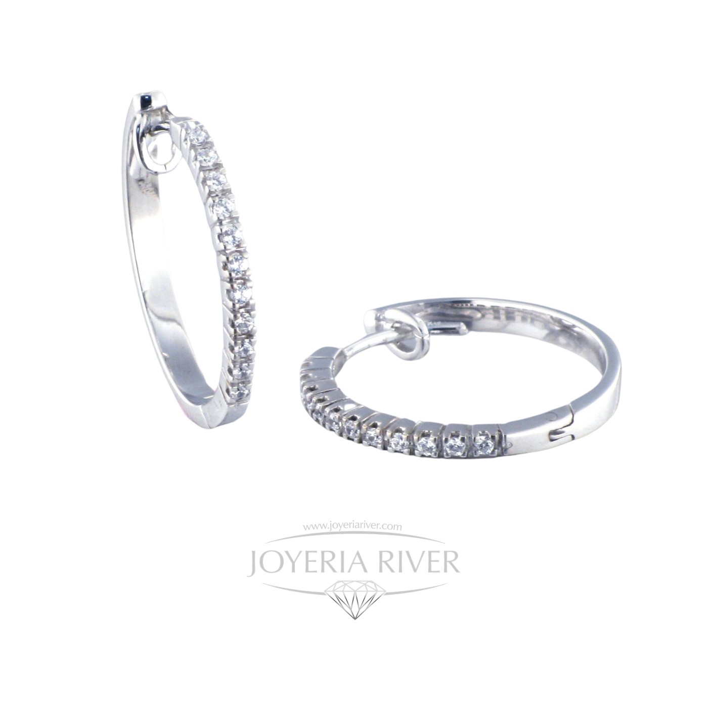 Pendientes de aro en oro blanco con un peso de aproximadamente 5.1gr, tienen 22 diamantes en talla brillante con un peso total de 0.18ct. en calidad G-VS. Su diámetro interior es de 17mm. Tiene 2 años de garantía y se envían con su certificado de autenticidad.