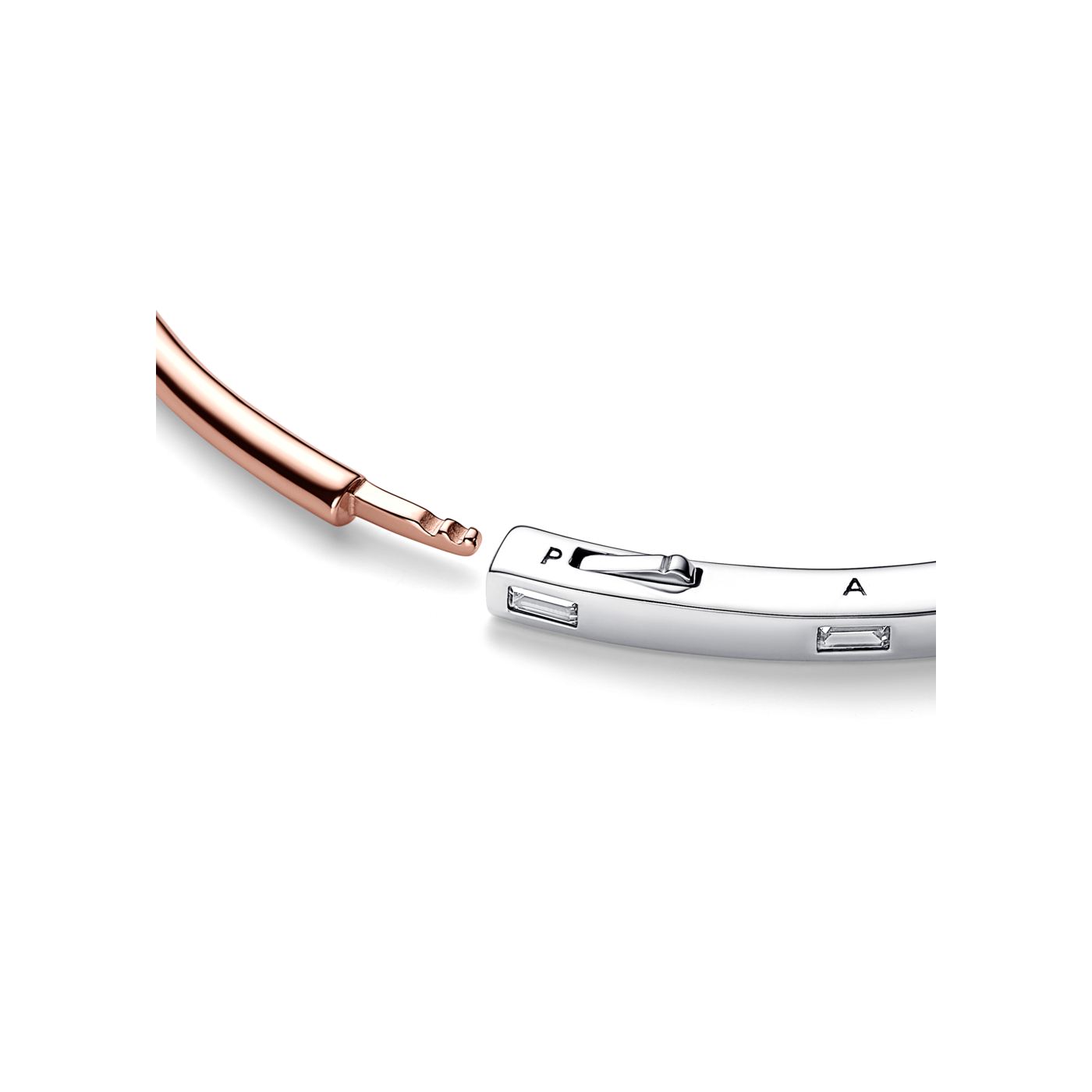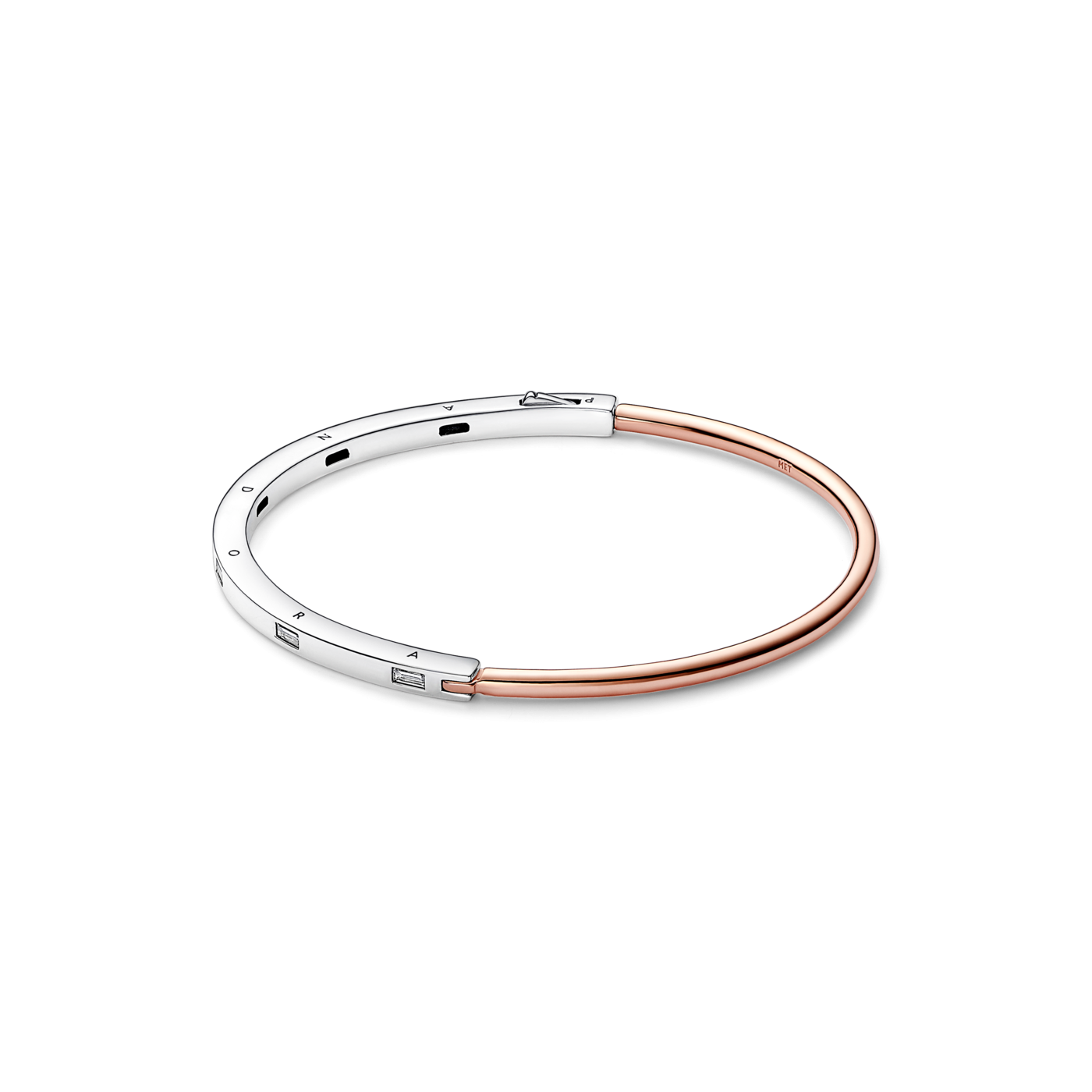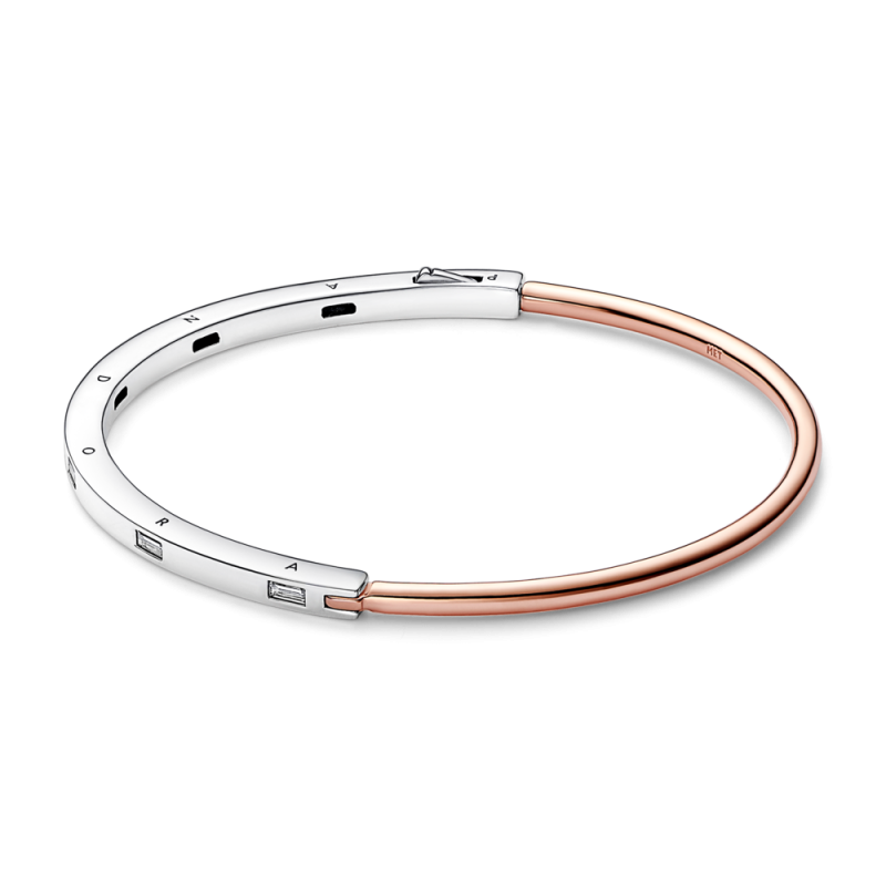 Pulsera Pandora Rígida 2 Tonos 582740C01: una joya elegante que combina la sofisticación de la plata con el brillo cálido del oro rosa y el destello de circonitas en talla baguette. Esta pulsera es perfecta para quienes buscan un accesorio versátil y con significado, ideal para regalar a esa persona especial que valora los detalles únicos y la belleza en cada momento. Sorprende a alguien que celebra sus logros o que disfruta expresar su estilo con piezas exclusivas.