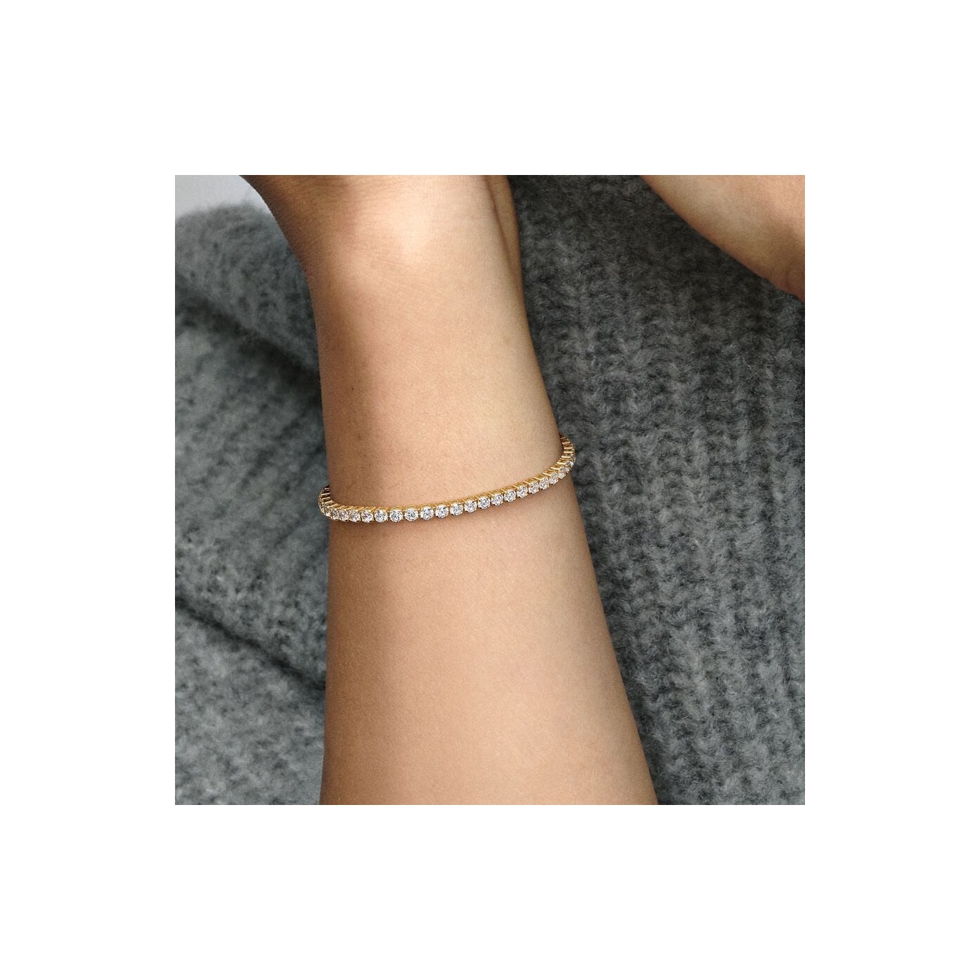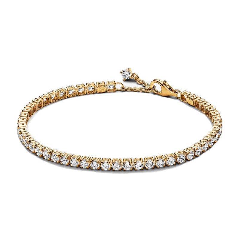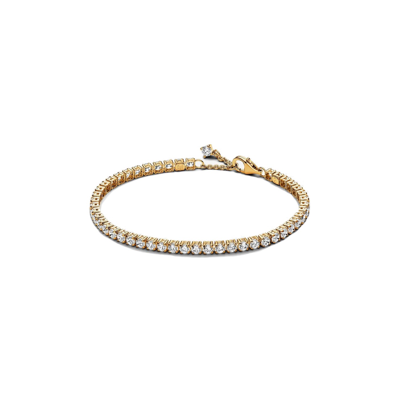 Pulsera Pandora Tenis Brillante Dorada 561469C01: una joya elegante y moderna, perfecta para quienes buscan un toque de sofisticación en su día a día. Su diseño en plata de ley con baño dorado la convierte en el accesorio ideal para resaltar cualquier look. Regálala a esa persona especial que valora el brillo y la elegancia en cada momento, o a alguien que celebra sus logros y disfruta luciendo piezas con significado propio.