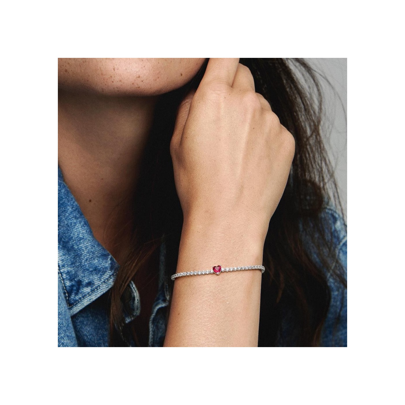 Pulsera Pandora Tenis Corazón Brillante Rojo 590041C02: una joya en plata de ley con un corazón rojo que destaca por su brillo y elegancia. Esta pulsera es perfecta para quienes viven con pasión y energía, ideal para regalar a esa persona especial que ama el deporte y pone el corazón en todo lo que hace. El detalle del corazón rojo simboliza fuerza, amor y determinación, convirtiéndola en un regalo significativo para motivar y celebrar logros personales.