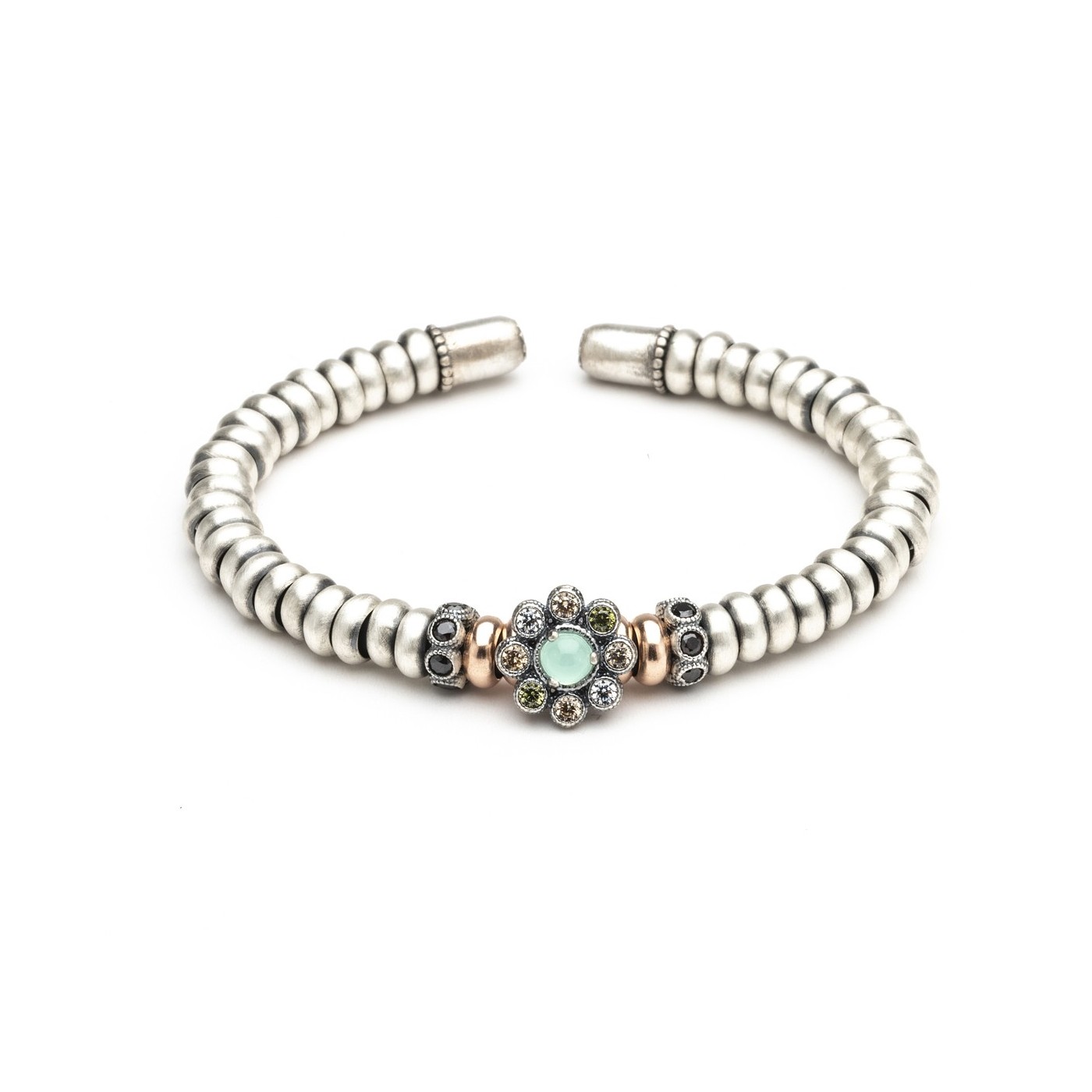 Pulsera Raive AN-82: una pieza elegante y versátil, diseñada con anillitas de plata sobre un cuerpo semirrígido que se adapta cómodamente a tu muñeca. Su detalle central de calcedonia y circonitas aporta un toque de brillo y color, ideal para complementar cualquier look diario o de ocasión especial. Llévala sola o combínala con otras pulseras para crear tu propio estilo.