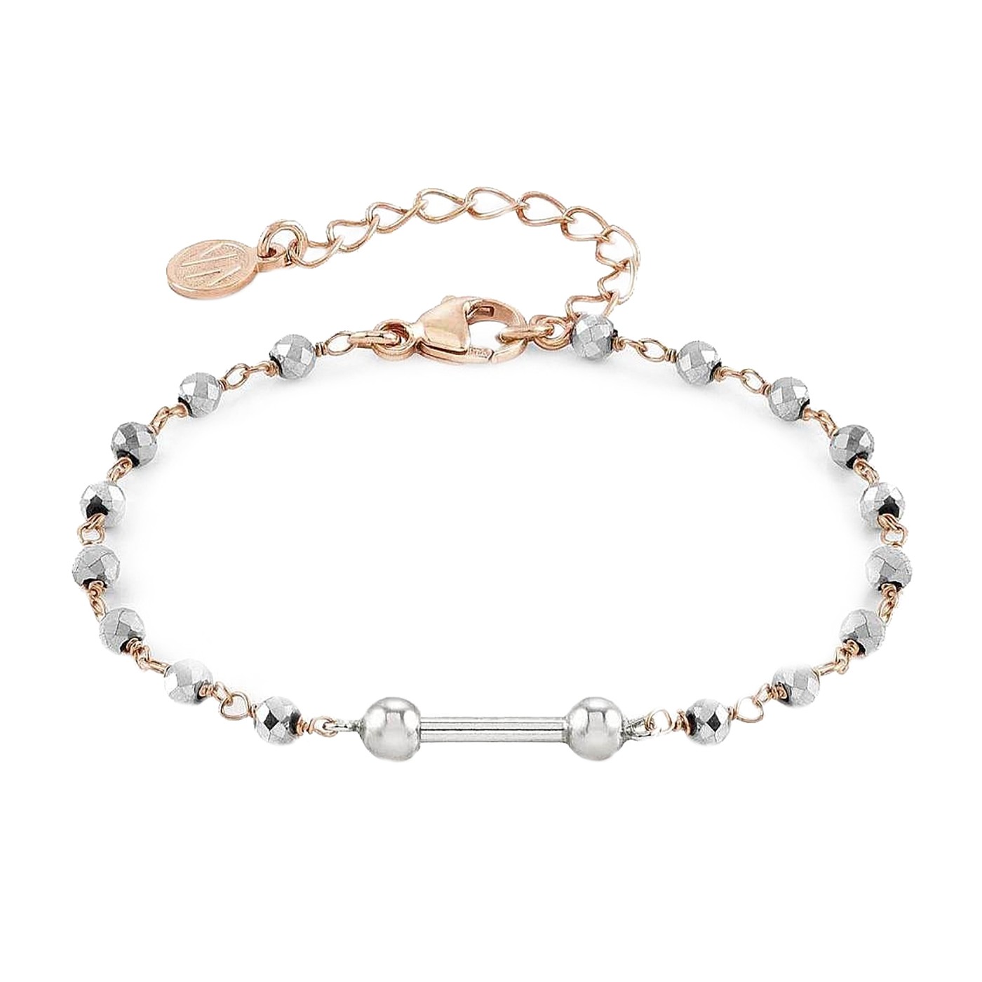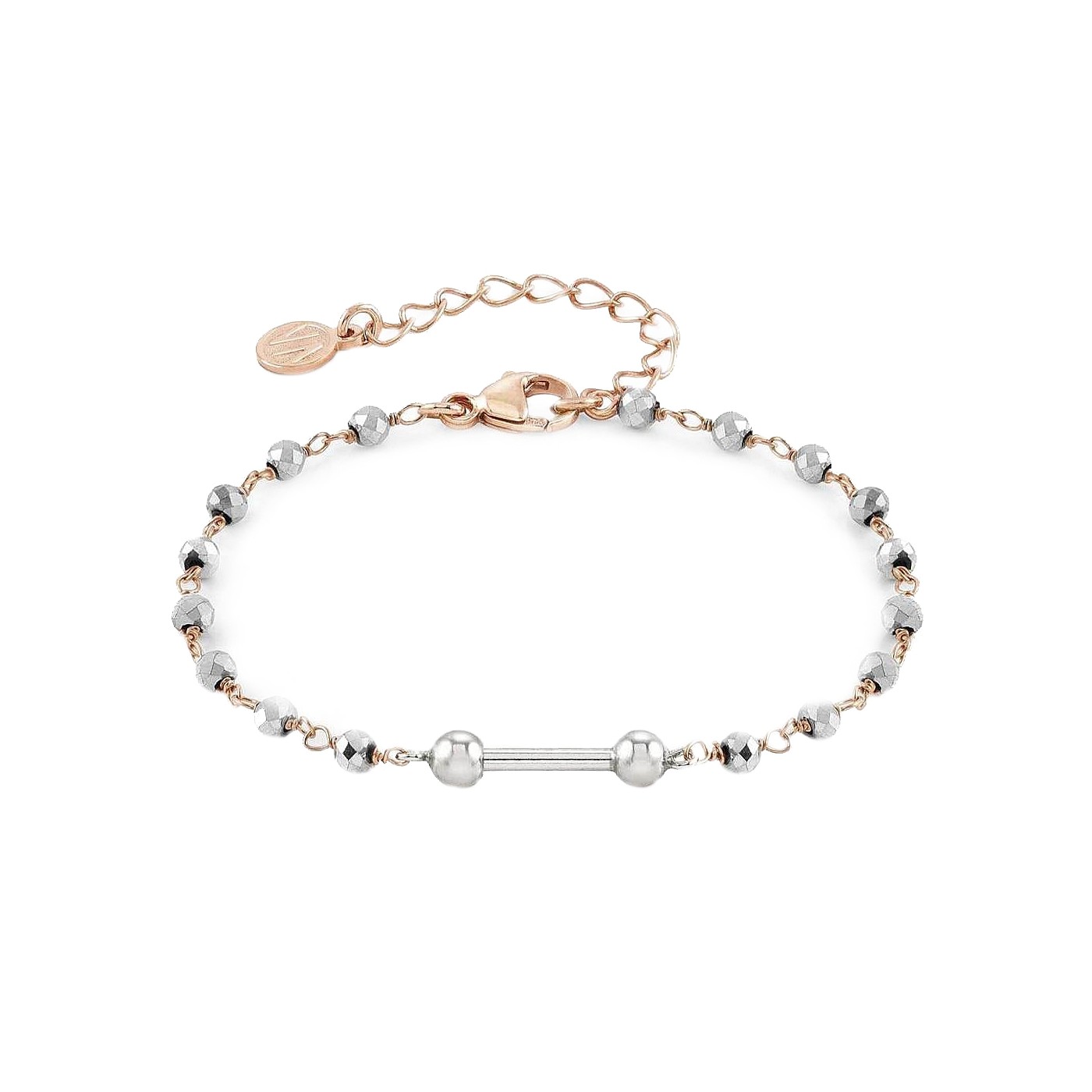 Esta pulsera esta hecha en plata; las bolitas son en plata con baño de rodio y la cadenita que las une son de plata bañada en rosa. En el centro lleva una parte donde se mete una de las piececitas de la colección seimia 147115