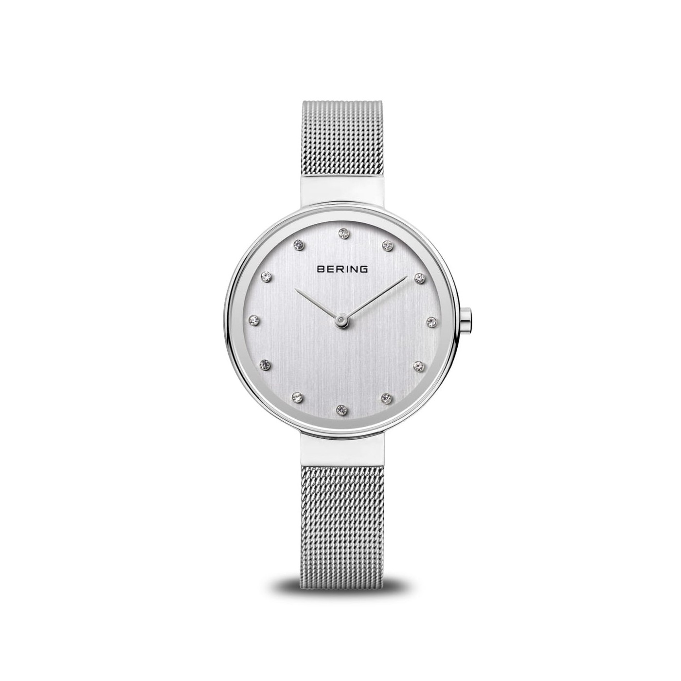 Este reloj para mujer de la colección BERING Classic combina minimalismo atemporal con detalles delicados. La caja de acero inoxidable plateado pulido de 34 mm enmarca una esfera plateada adornada con doce marcadores de cristal brillantes. Las agujas plateadas delgadas completan el diseño puro.