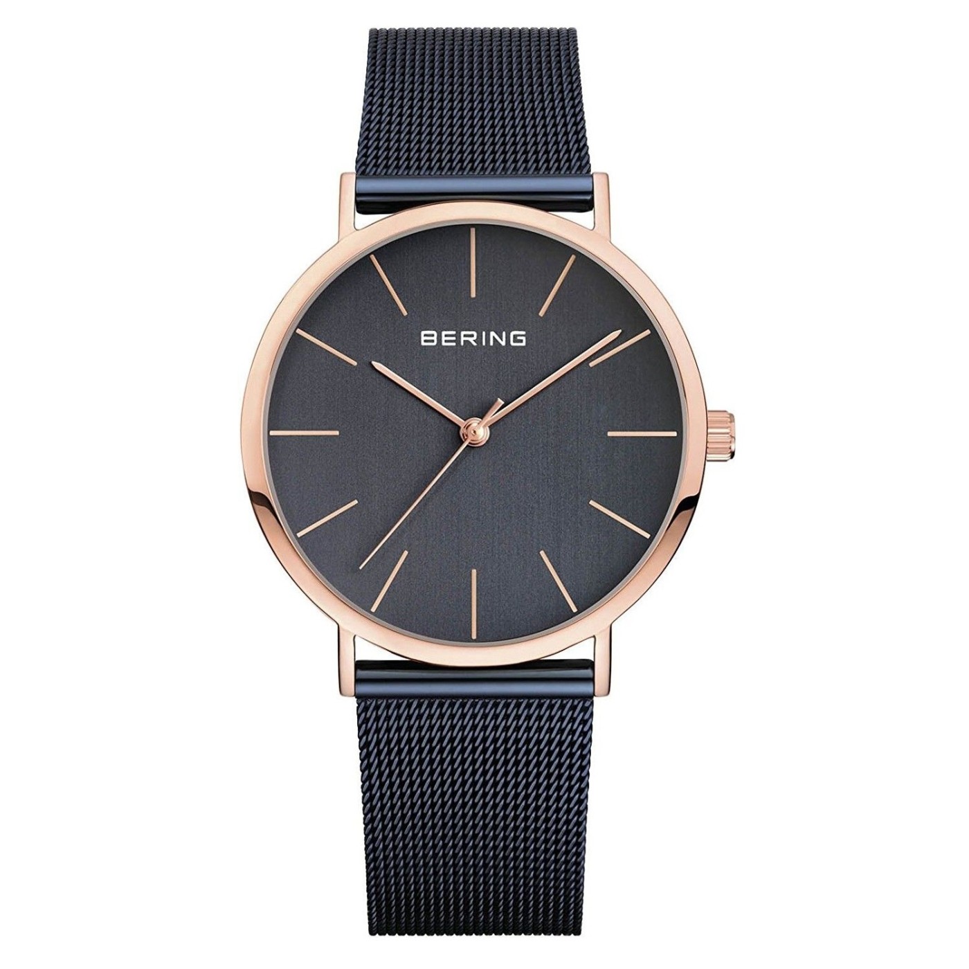 Reloj Bering 13436-367 en acero con correa de malla milanesa ip azul y caja ip rosa de 36mm. Tiene movimiento de cuarzo, cristal zafiro y es sumergible 3 atm.