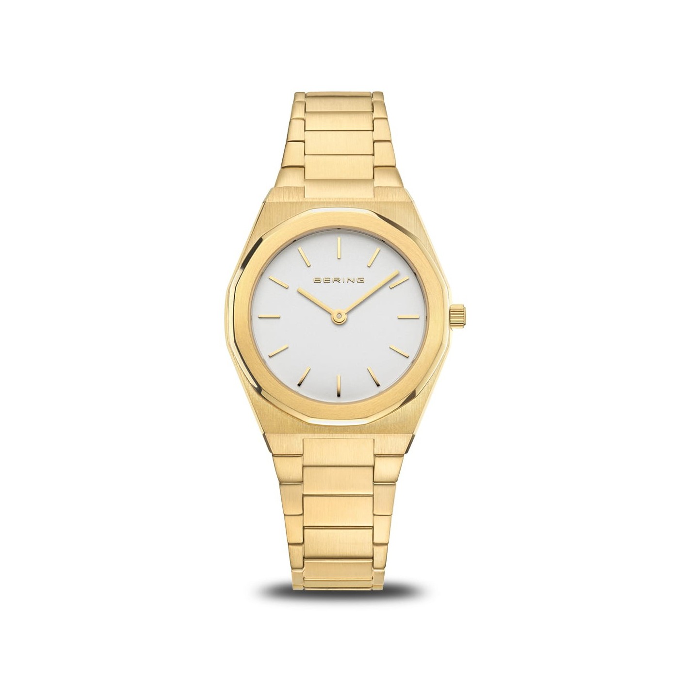 Este reloj para mujer de la colección BERING Classic combina simplicidad atemporal con un toque de lujo. La caja de acero inoxidable en oro pulido y cepillado (32 mm) aporta un brillo moderno, mientras que la esfera plateada con índices dorados y agujas finas refuerza su carácter minimalista.