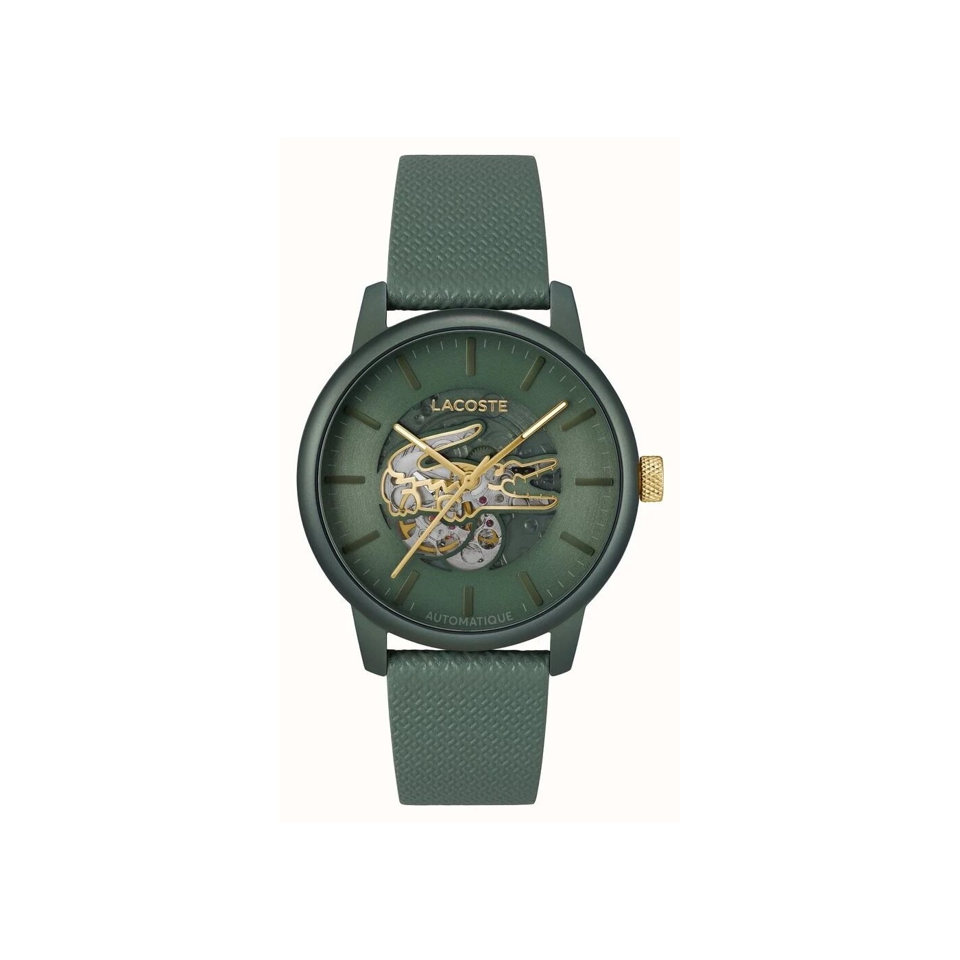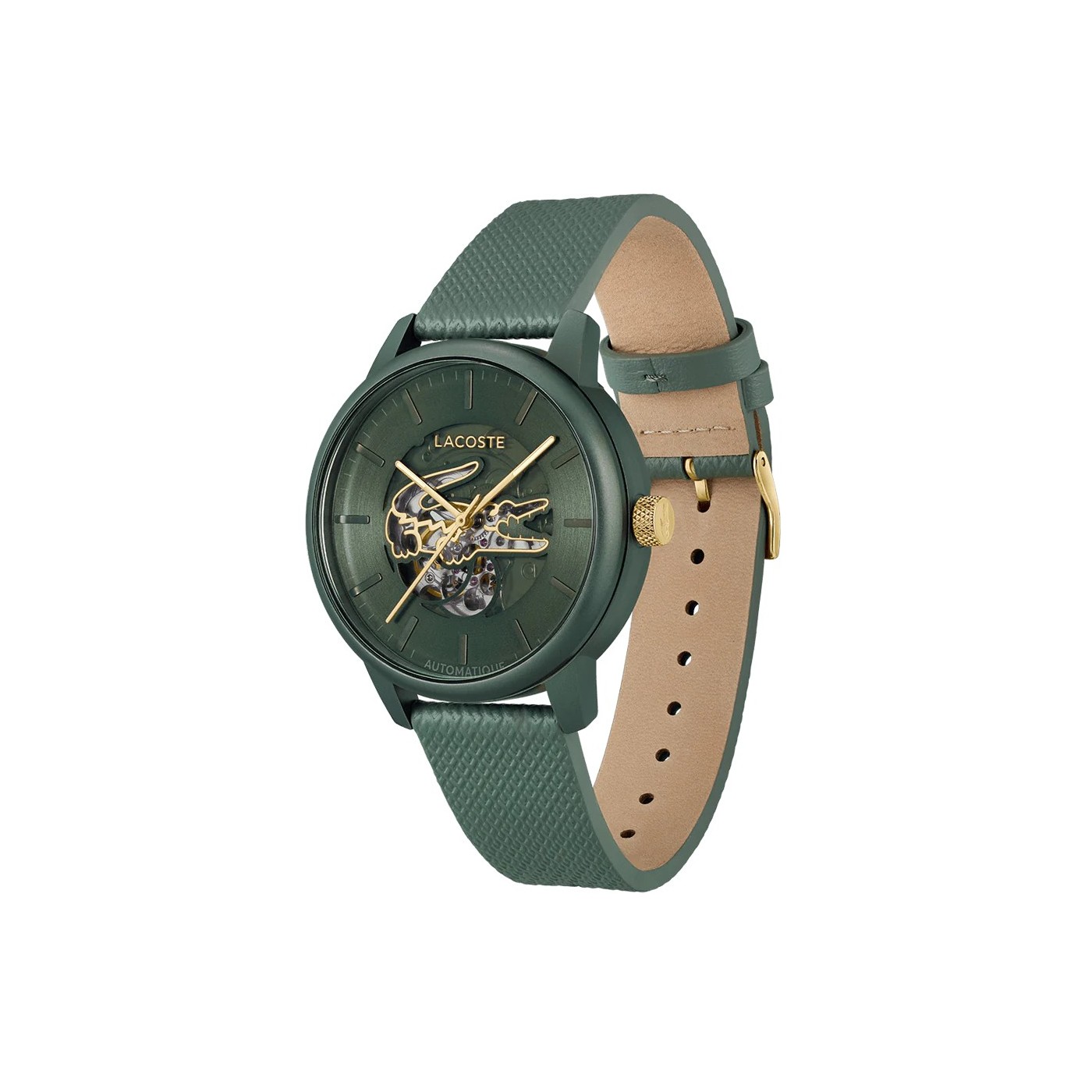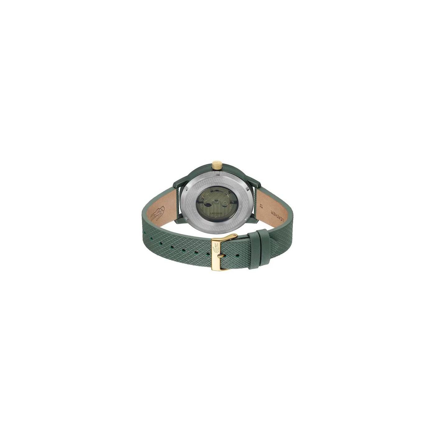 - Movimiento automático con esqueleto visto, decorado con el icónico logo de cocodrilo dorado.