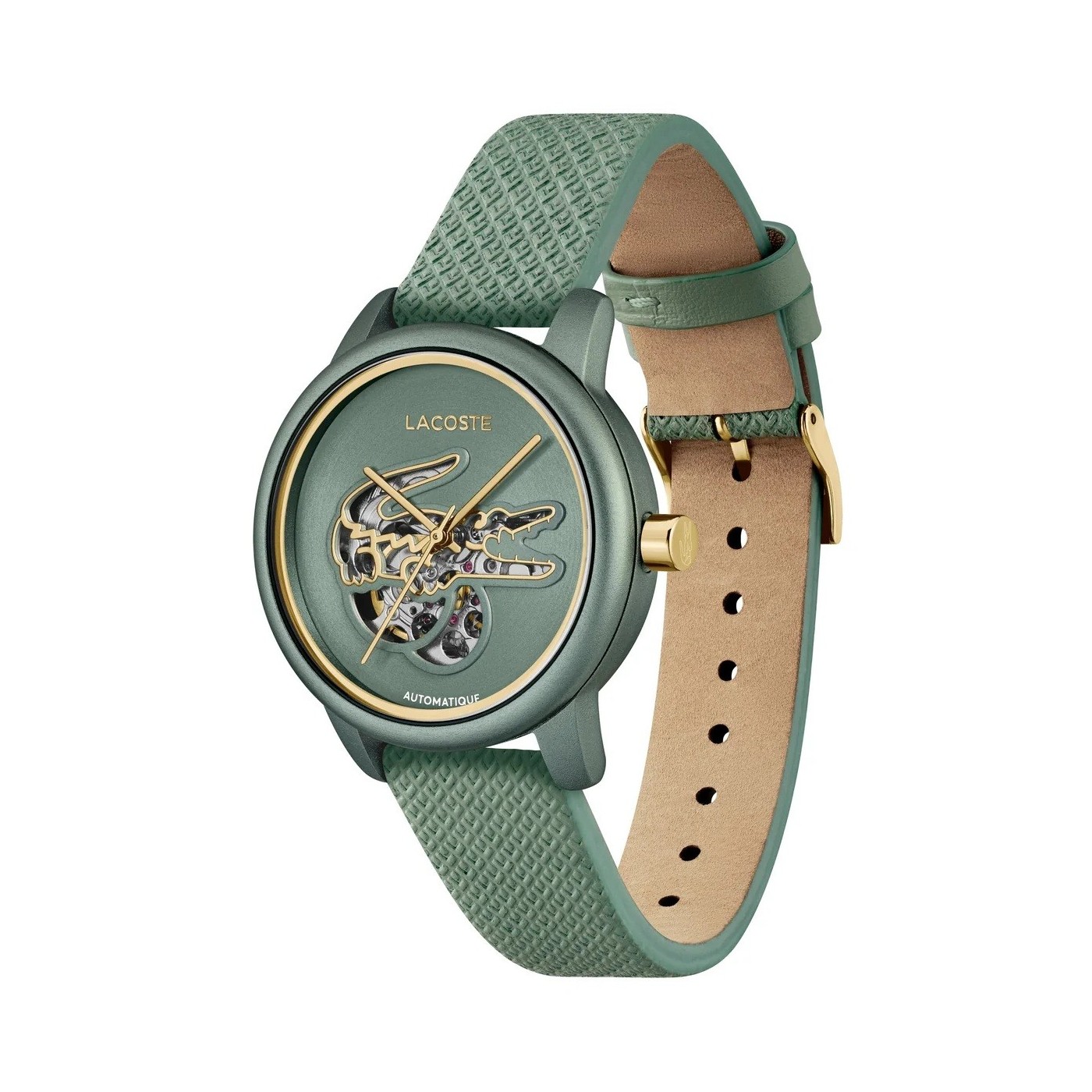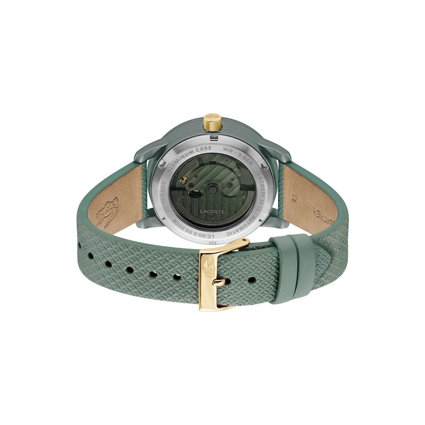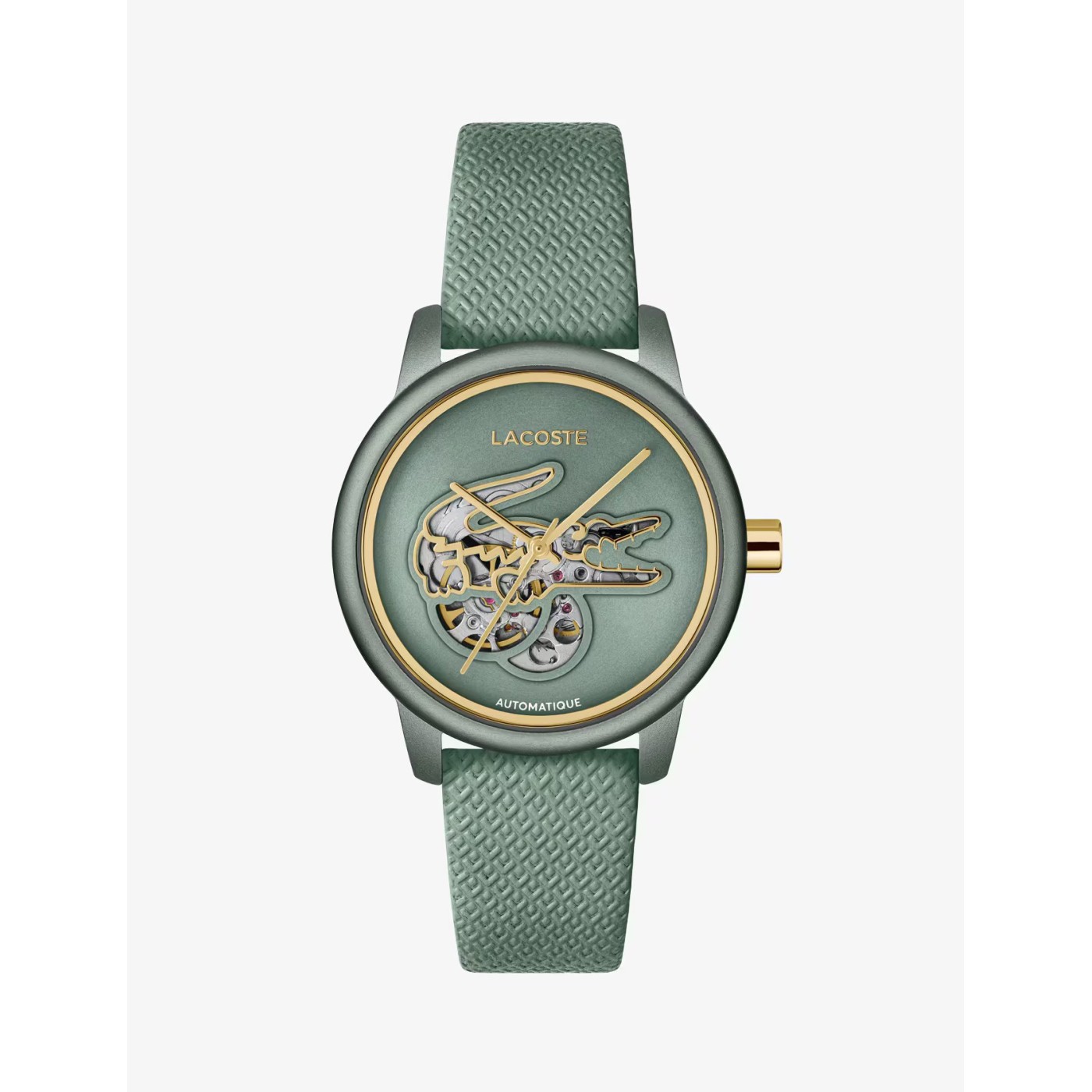 El reloj Lacoste 12.12 Auto se renueva, fusionando elegancia y funcionalidad. Cuenta con movimiento automático, caja de aluminio y correa de piel texturizada. Un estilo sofisticado con un recorte en forma de cocodrilo en la esfera que deja ver el mecanismo, un detalle distintivo.