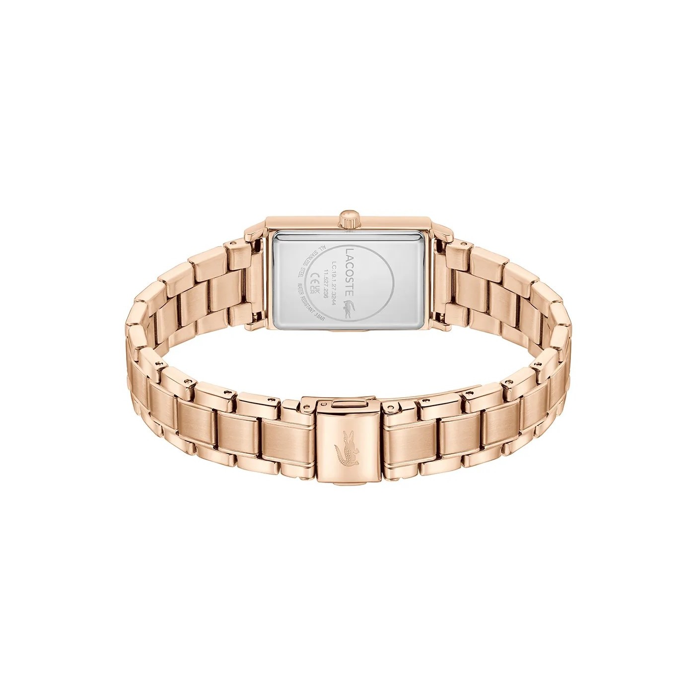 El Reloj Lacoste Catherine 2001405 destaca por su diseño rectangular y moderno. Su caja de acero con baño IP rosa (28.3 x 20.3 mm) combina perfectamente con la esfera verde, creando un contraste sofisticado y actual.