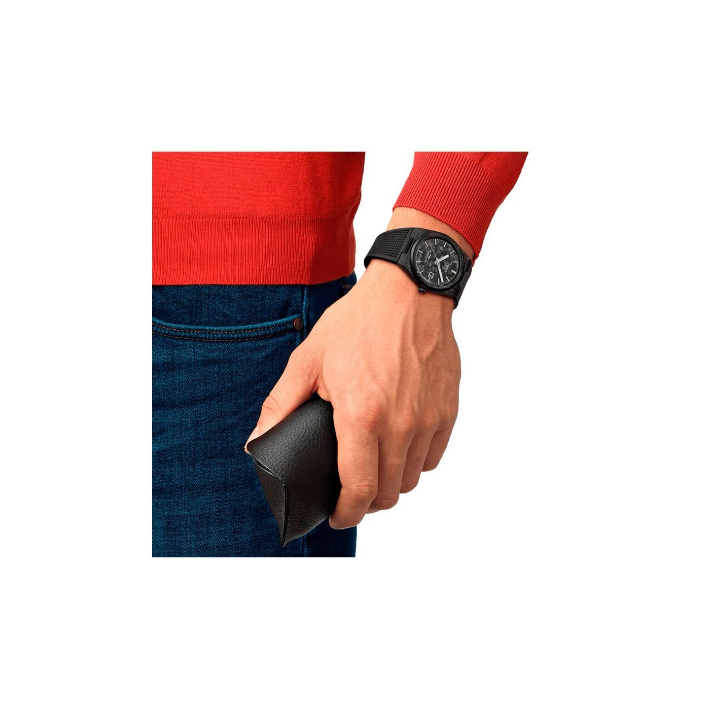 - Correa de caucho negro con hebilla estándar de acero recubierta en PVD negro.