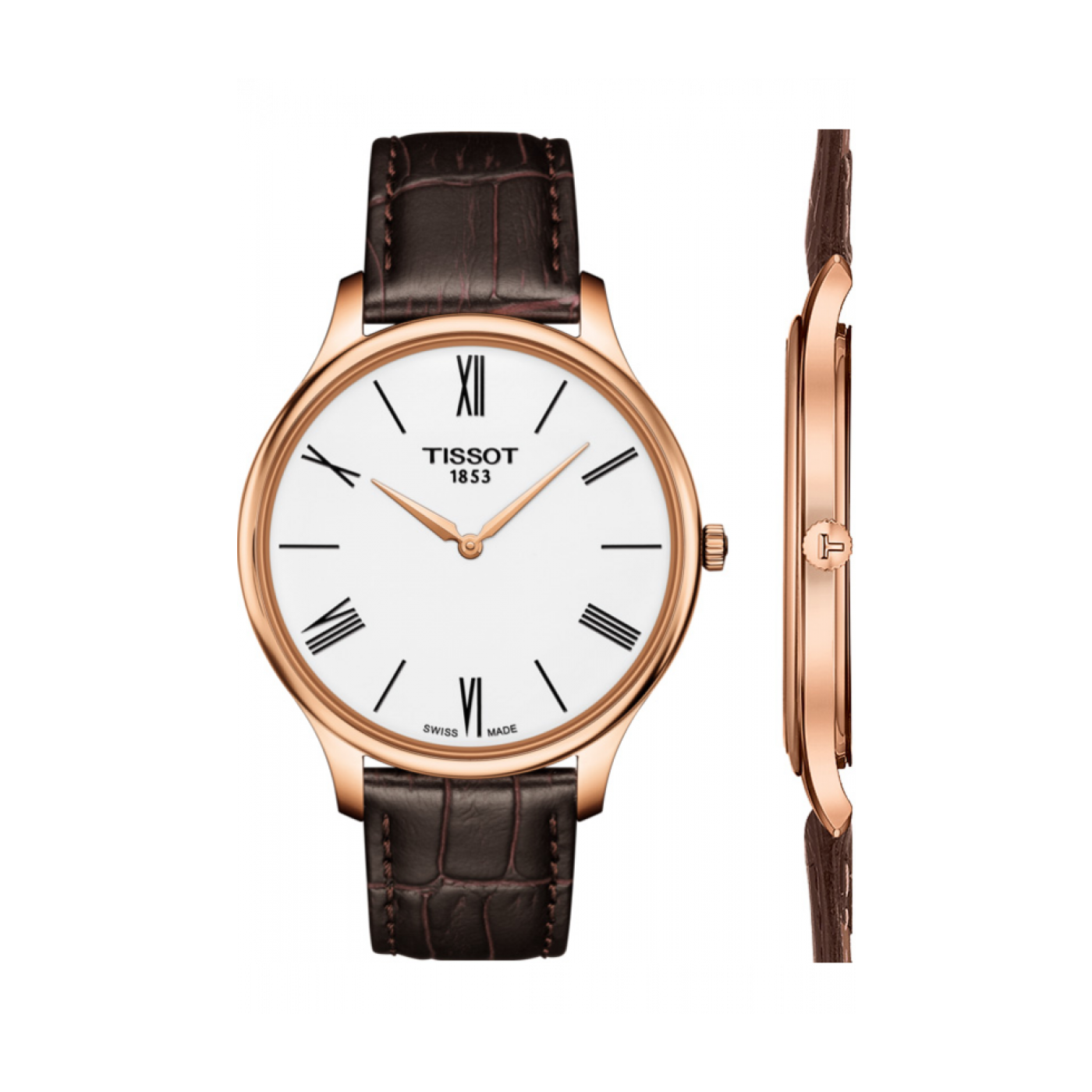 El Tissot Tradition 5.5 ofrece una amplia variedad de modelos. Este modelo, en concreto presenta una esfera blanca con númros romanos, una caja de acero inoxidable con un acabado PVD en oro rosa y una correa de piel marrón chocolate.