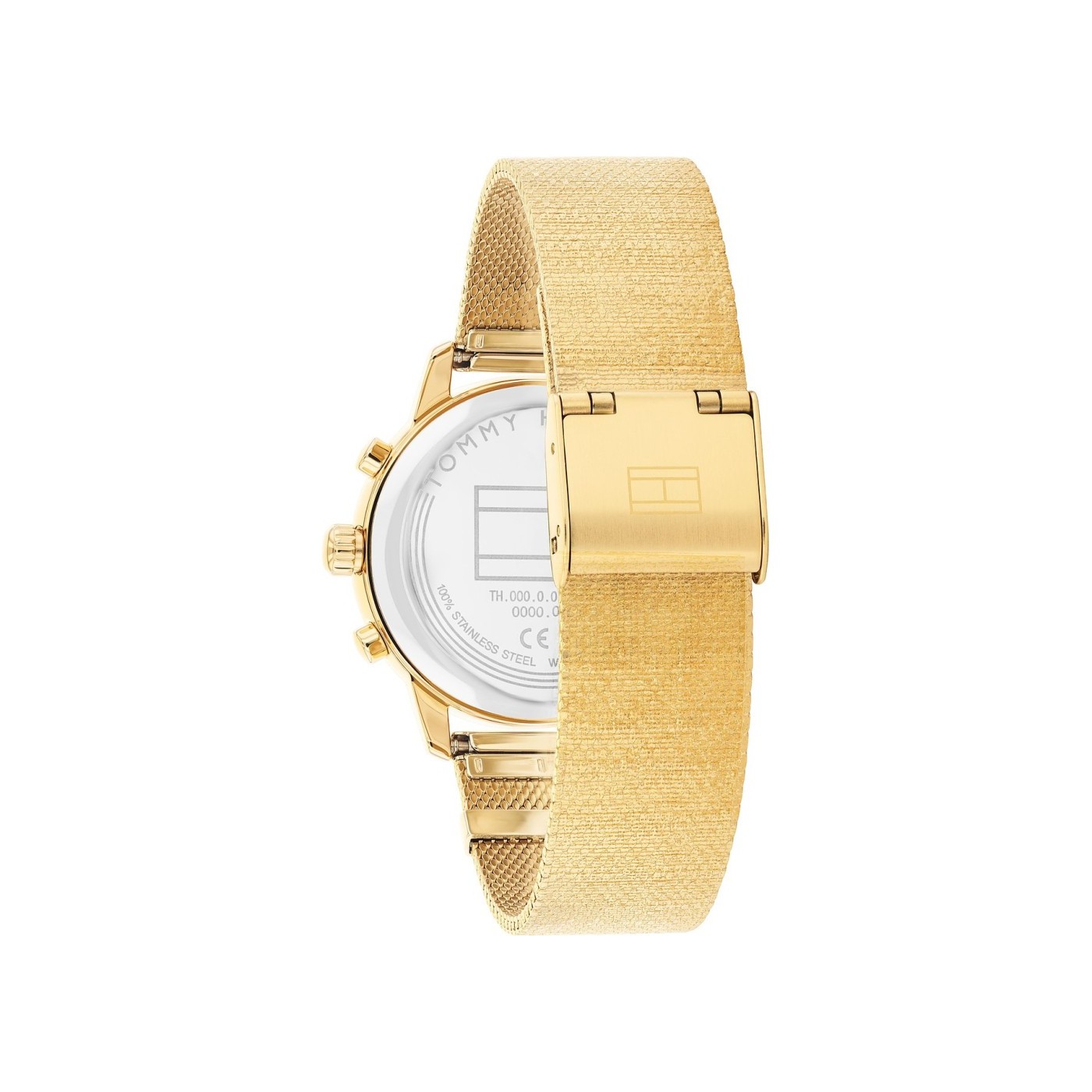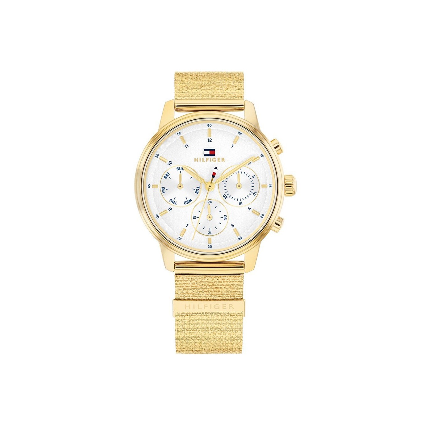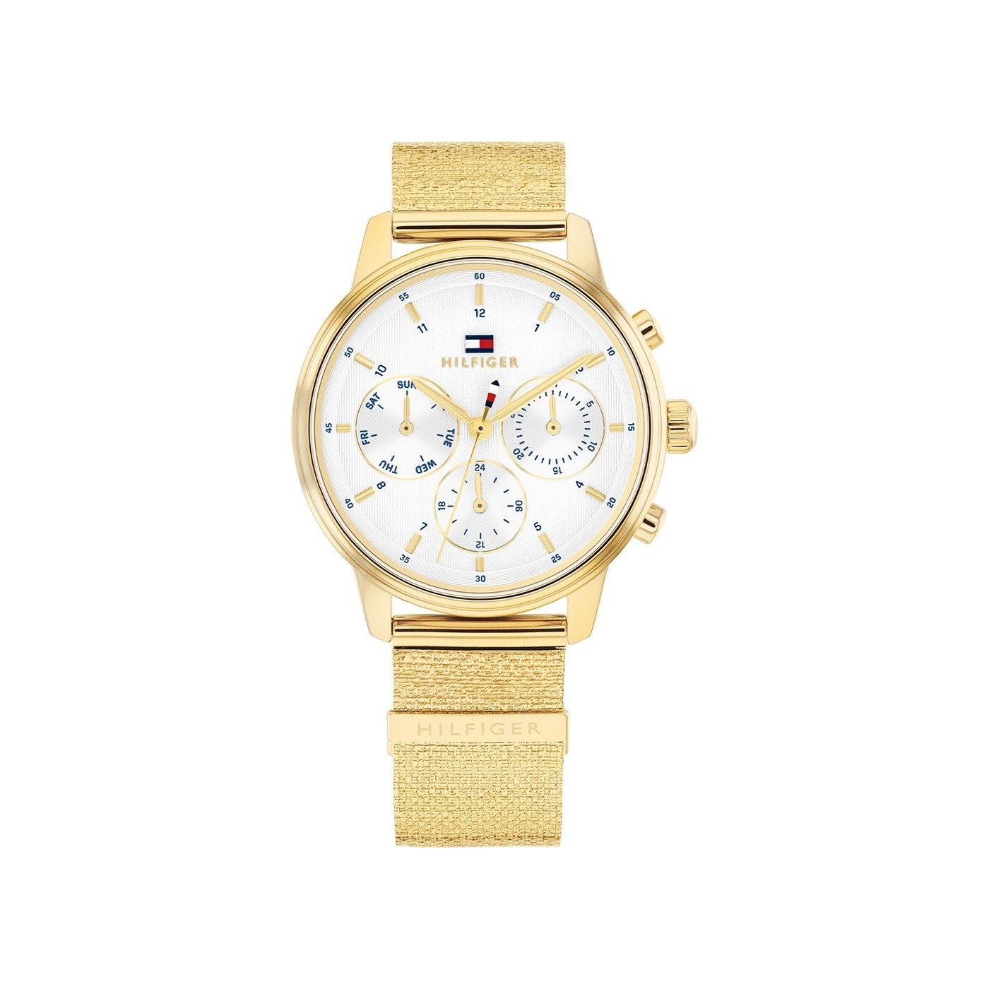 Reloj Tommy Hilfiger para mujer de la colección Blake fabricado en acero inoxidable dorado. Estamos ante un elegante reloj de diseño femenino compuesto por caja de 34mm de diámetro con esfera blanca que cuenta con indicadores en forma de barras doradas al igual que sus agujas movidas por mecanismo de cuarzo analógico con función de cronógrafo. Todo ello protegido por cristal mineral. Su brazalete es de malla milanesa en dorado con cierre deslizante de seguridad. Resistente al agua hasta 5 ATM. Tiene 2 años de garantía