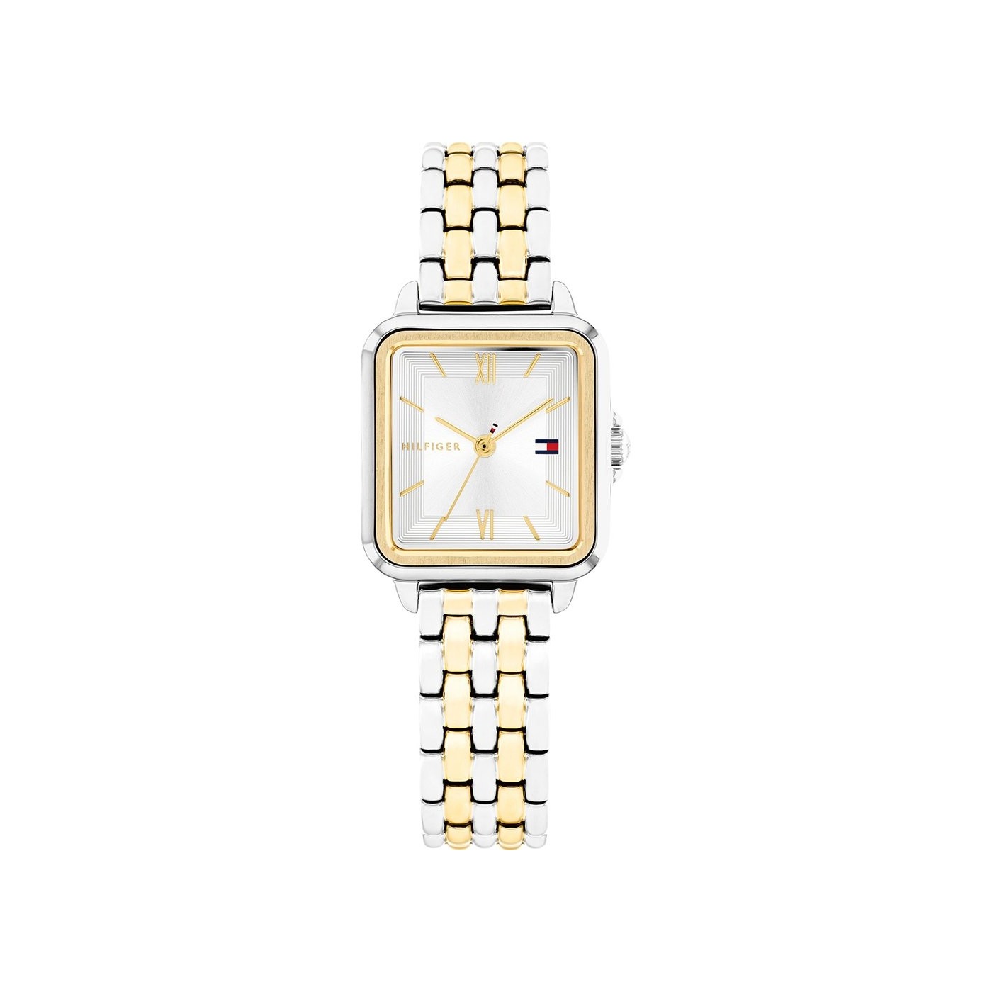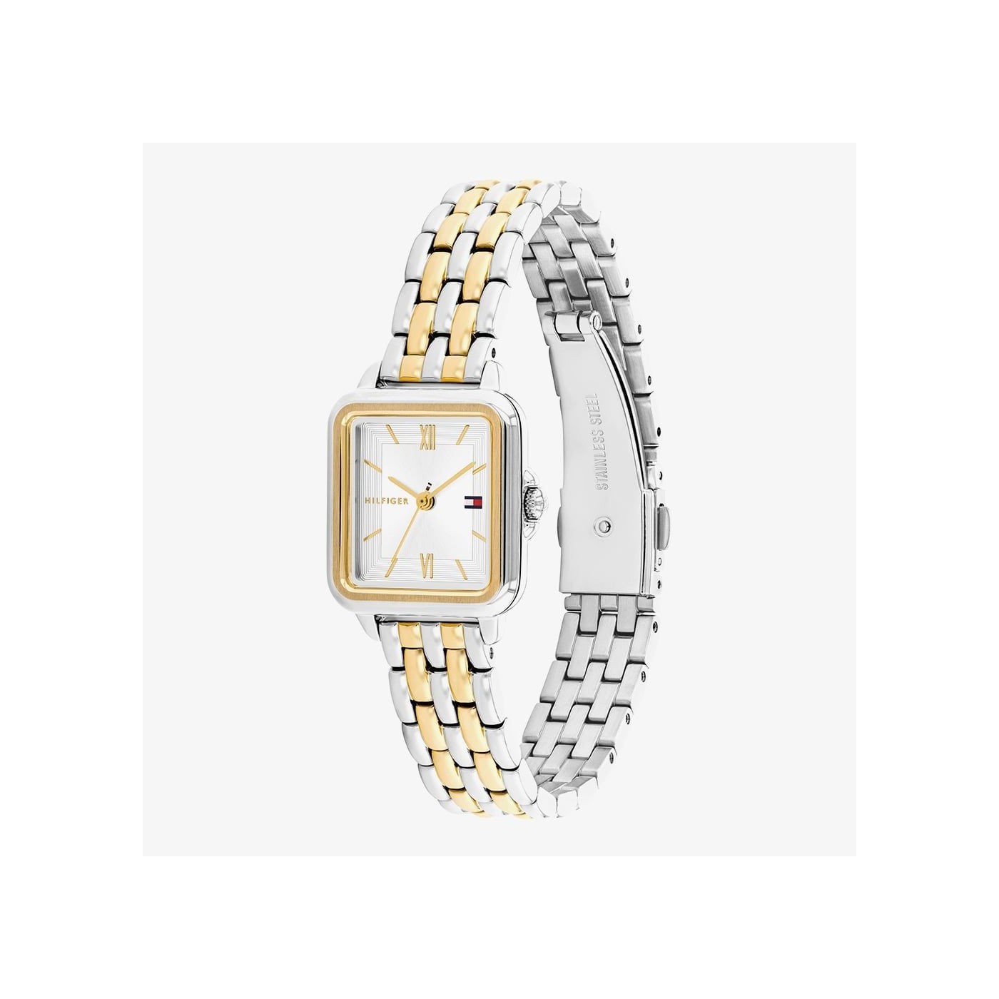 Este reloj marca Tommy Hilfiger tiene una caja de Inox con un diámetro de 24 mm y cuenta con una correa de acero conmbinada con eslabones bañados en ip dorado. Dentro de la caja se encuentra un mecanismo de alta calidad el cual esta protegido por un cristal Mineral. El reloj es resistente al agua hasta 3 ATM. Esto significa que el reloj es resistente a salpicaduras de agua. Tiene 2 años de garatía