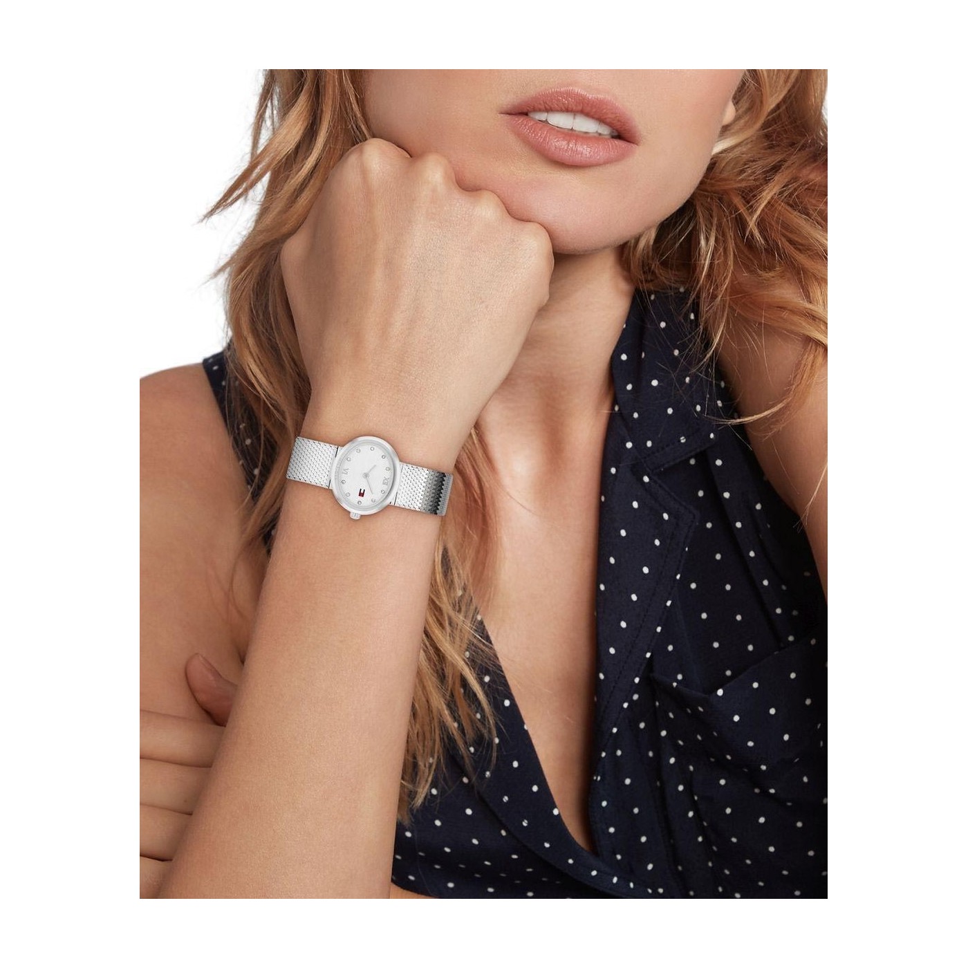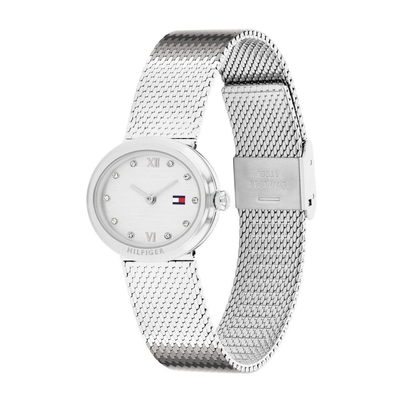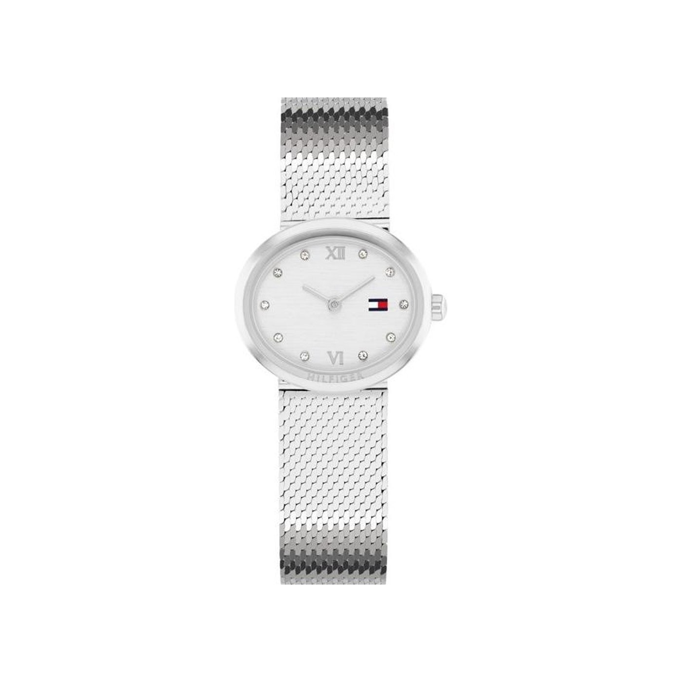 Reloj Tommy Hilfiger para mujer de la colección Moira fabricado en acero inoxidable plateado. Estamos ante un atractivo reloj compuesto por caja ovalada de 25x22mm con bisel plateado al igual que su esfera compuesta por indicadores formados por cristales brillantes y agujas plateadas movidas por mecanismo de cuarzo analógico. Todo ello protegido por cristal mineral. Su brazalete es de malla milanesa con cierre deslizante de seguridad. Resistente al agua hasta 5 ATM. Tiene 2 años de garantía