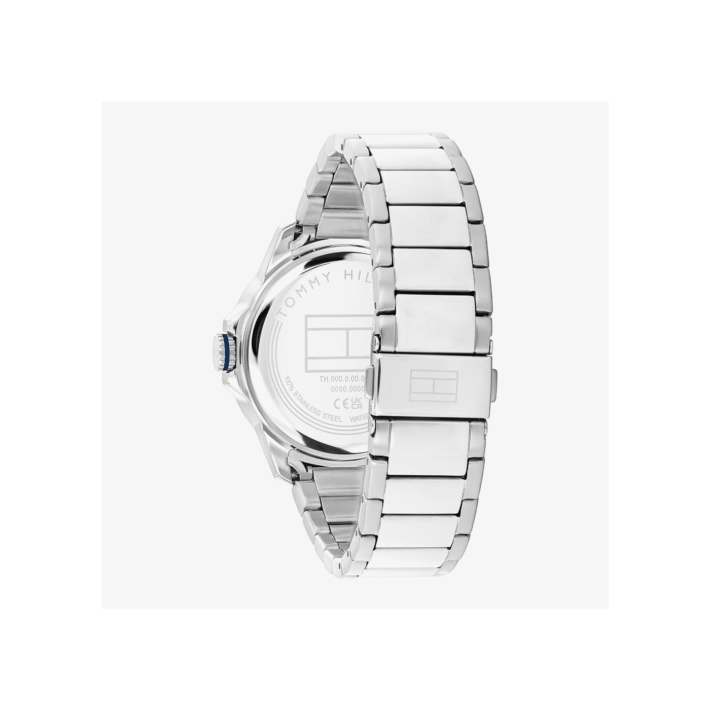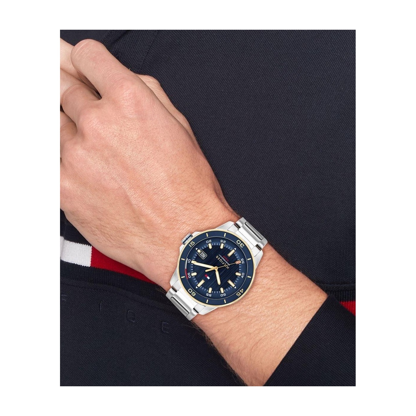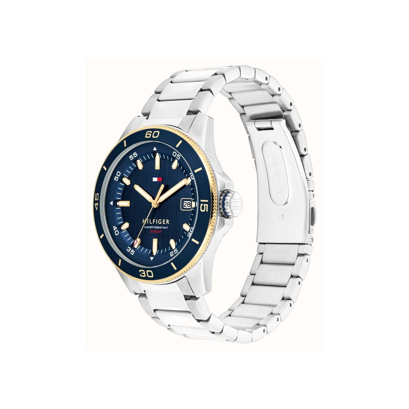 Reloj Tommy Hilfiger para hombre de la colección Remy fabricado en acero inoxidable plateado. Estamos ante un atractivo reloj compuesto por caja de 43mm de diámetro con bisel de aluminio azul que su esfera con indicadores en forma de barras doradas al igual que sus agujas movidas por mecanismo de cuarzo analógico con función de calendario. Todo ello protegido por cristal mineral. Su armys lo forman eslabones plateados con cierre desplegable mediante doble pulsador. Resistente al agua hasta 5 ATM. Tiene 2 años de garantía