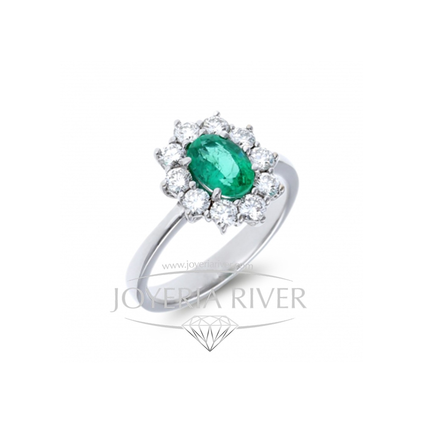 Sortija Oro Blanco, Esmeralda y Diamantes R649I012: una joya única que combina la elegancia del oro blanco (3.9g aprox.) con la belleza de una esmeralda natural central de 7 x 5 mm y el brillo de 10 diamantes talla brillante (0.70ct en total).